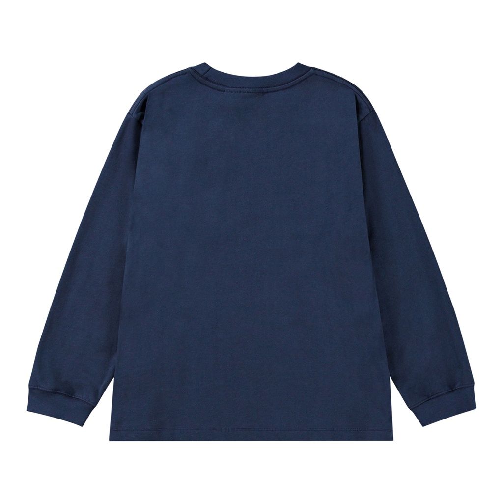 Dunkelblaue Bluse aus Öko-Baumwolle mit langen Ärmeln, Rundhalsausschnitt und geripptem Abschluss an Ausschnitt und Ärmeln. Sie hat eine lockere Passform und einen Motivdruck auf der Vorderseite.