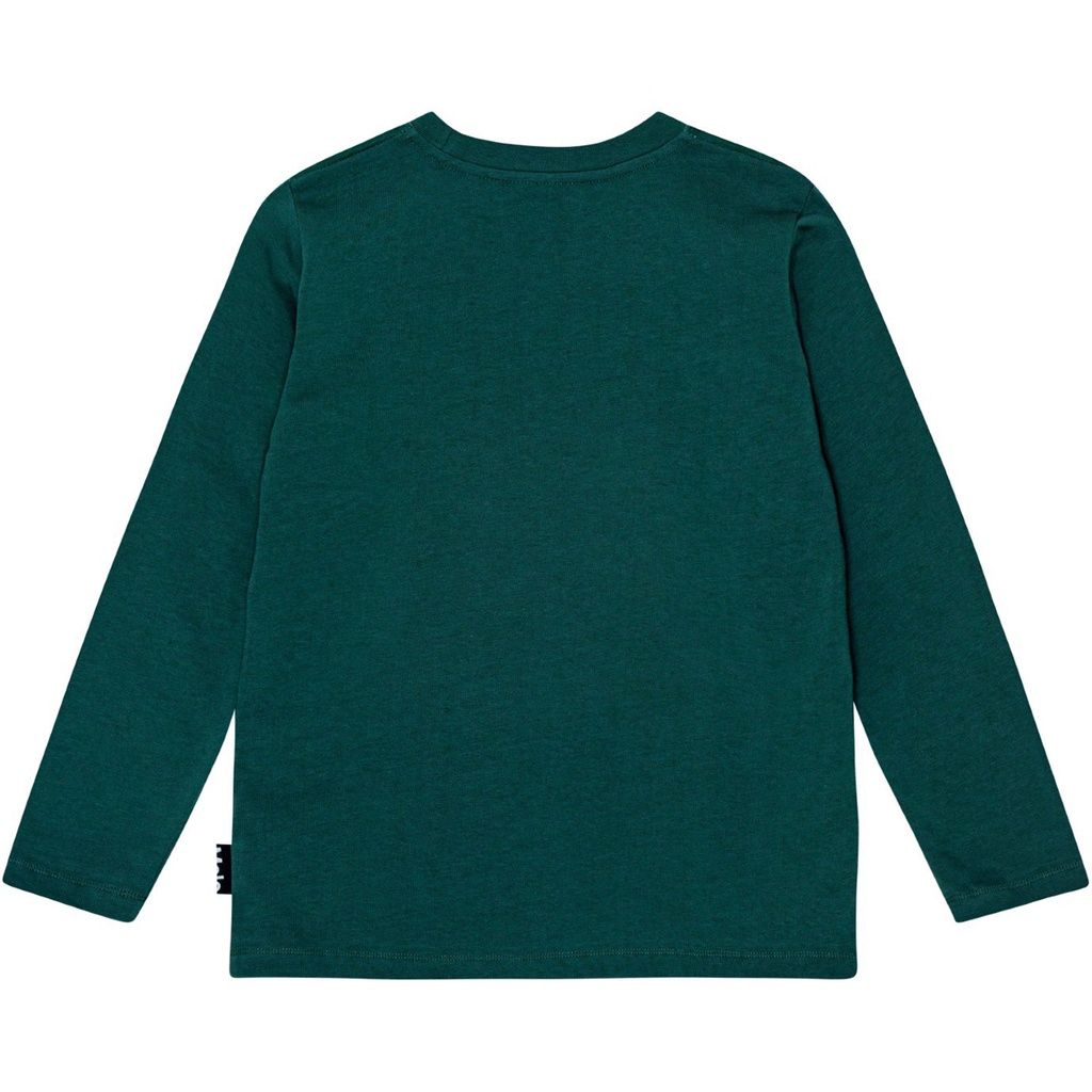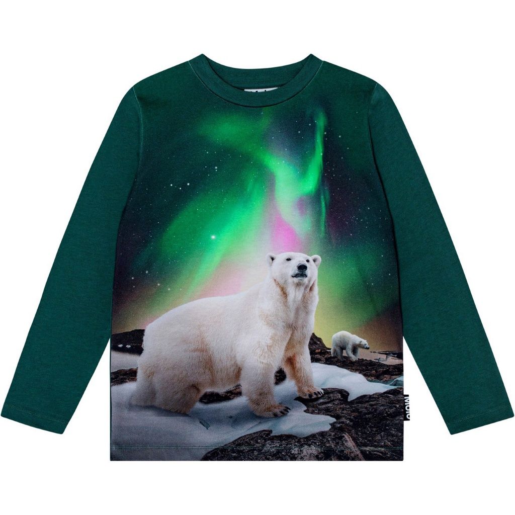 Grünes Langarmshirt aus Öko-Baumwolle mit langen Ärmeln, Rundhalsausschnitt und geripptem Saum. Das Langarmshirt hat eine normale Passform und einen Druck auf der Vorderseite, der den majestätischen Eisbären zeigt, der unter einem Abendhimmel mit Nordlichtern steht.
