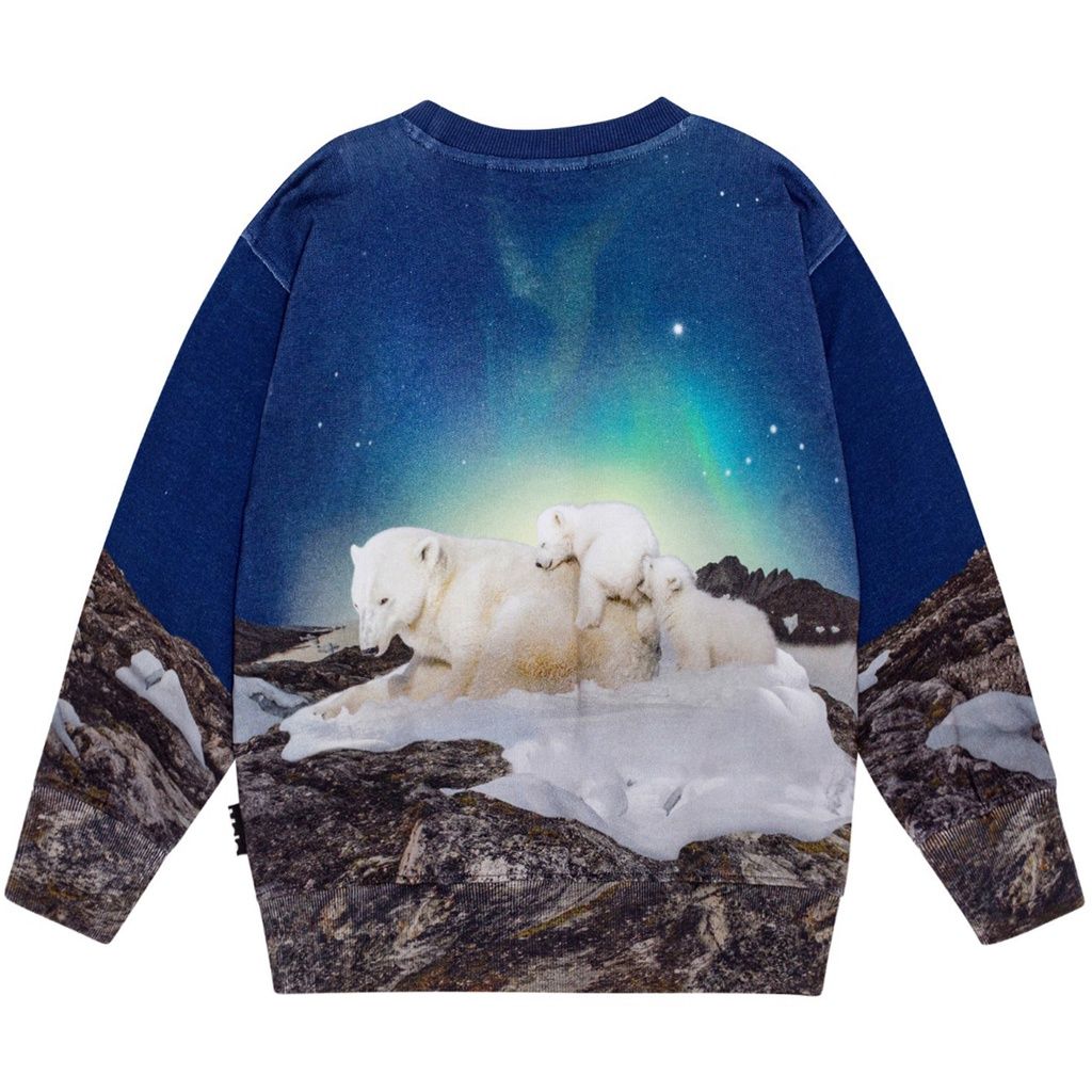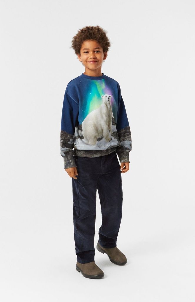 Dunkelblaues Sweatshirt aus Öko-Baumwolle mit Rundhalsausschnitt, gerippten Bündchen und Saum. Das Sweatshirt hat eine normale Passform und eine gebürstete Innenseite, die es weich und warm zu tragen macht.