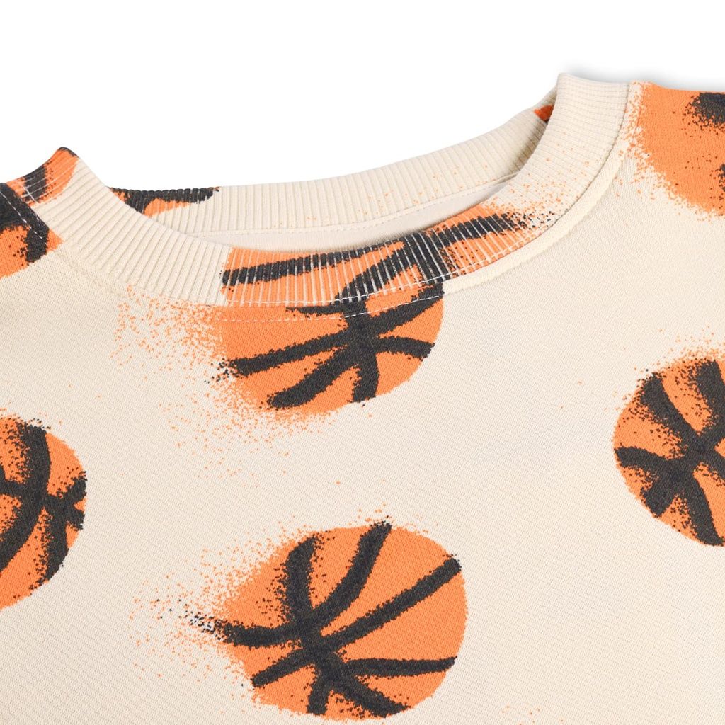 Locker, weich und voller Spass: Das beige Molo Sweatshirt überzeugt mit einer bequemen Passform und liebevollen Details. Die gerippten Bündchen an Halsausschnitt, Ärmeln und Saum sorgen für optimalen Sitz, während der fröhliche Aufdruck aus orangefarbenen, lächelnden Basketbällen jedem Outfit einen verspielten Touch verleiht.