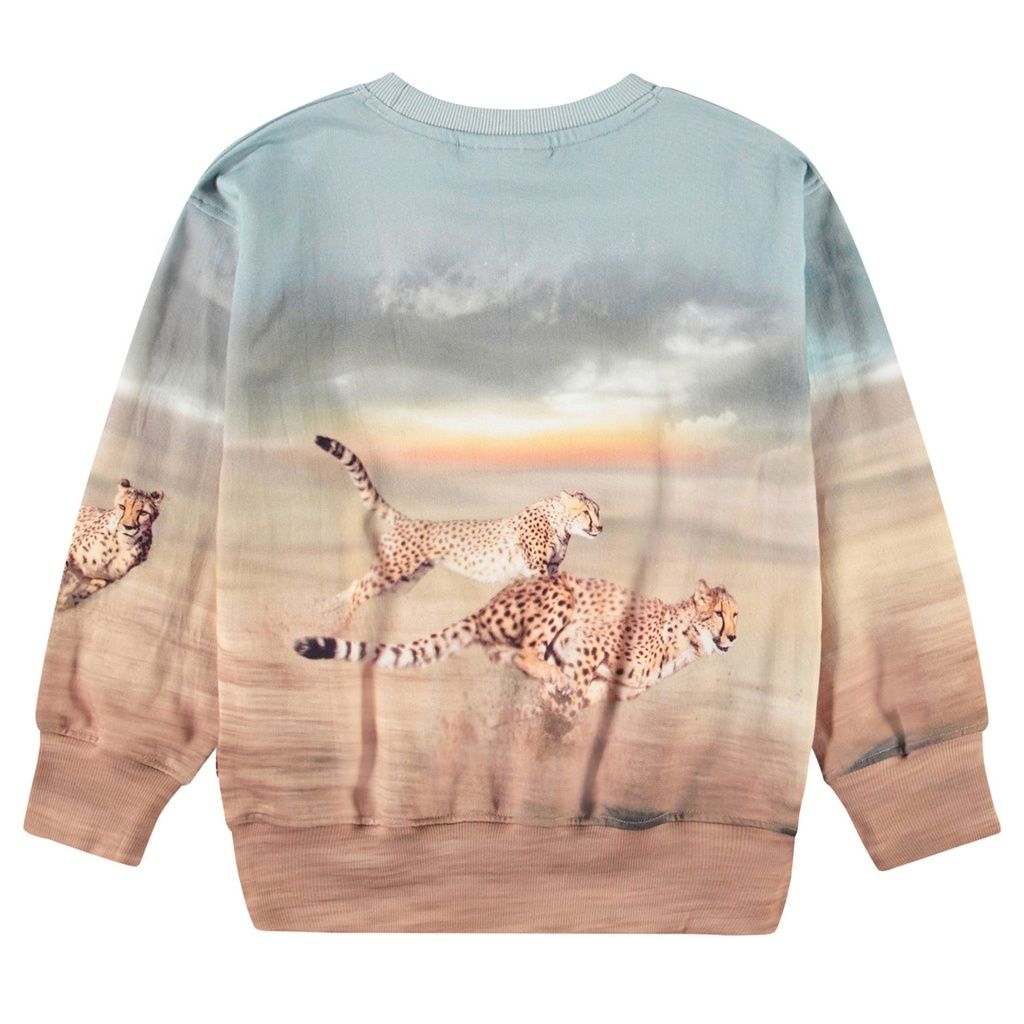Blaues und braunes Sweatshirt aus weicher Öko-Baumwolle mit gerippten Kanten am Hals, an den Ärmeln und am unteren Saum des Sweatshirts. Das Sweatshirt hat eine normale Passform und einen Aufdruck von Geparden, die in voller Geschwindigkeit rennen.