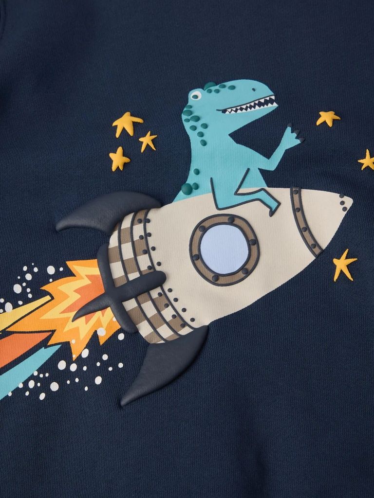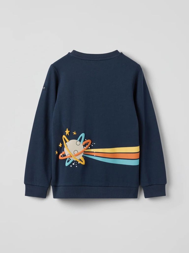 Dieses Shirt aus 100 % Bio-Baumwolle in weicher Sweatshirtqualität ist ein echtes Lieblingsstück für jeden Tag. Der grosse Weltraumdruck, der sich von der Vorderseite bis über den Rücken zieht, macht das Oberteil zu einem besonderen Hingucker.