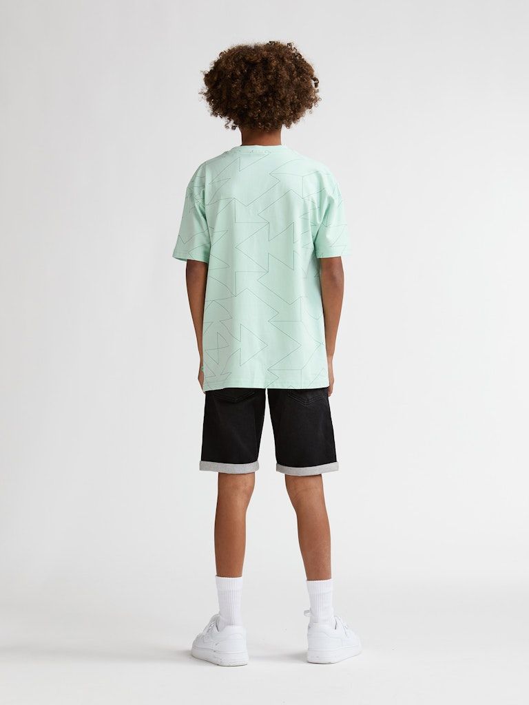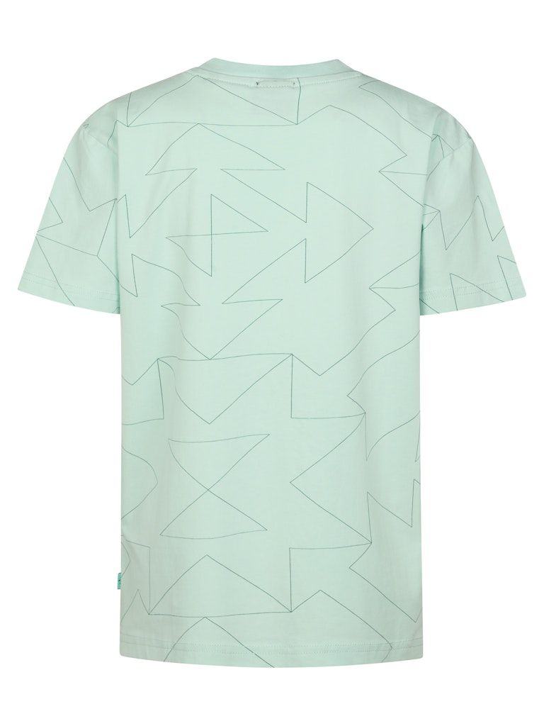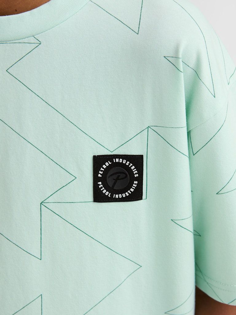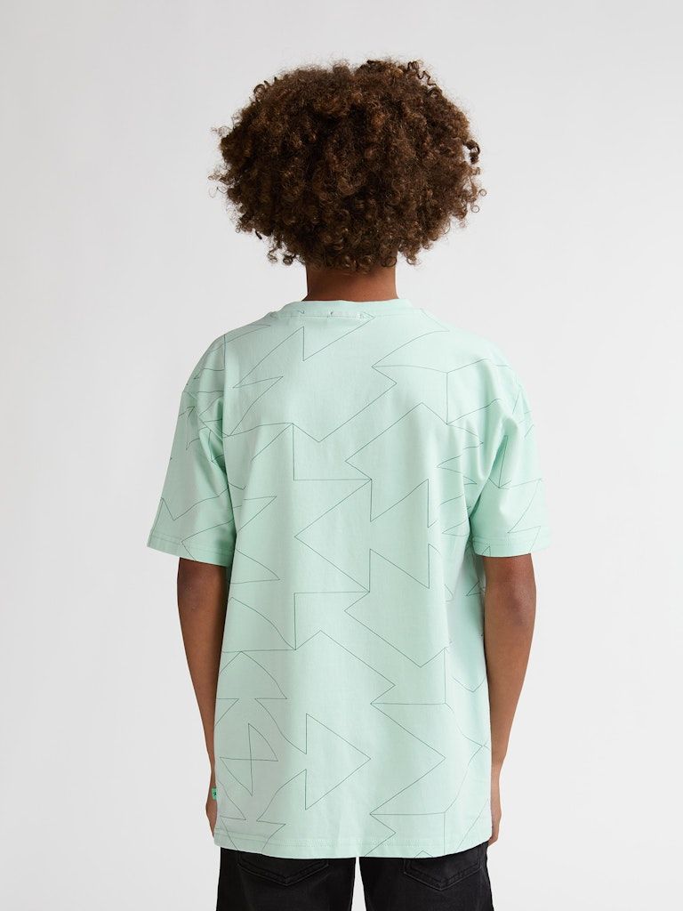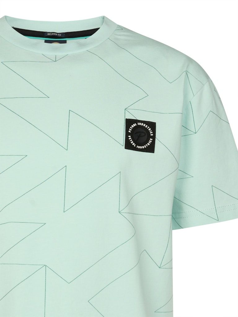 Der gerade Saum und die kurzen Ärmel unterstreichen den lässigen Look, während der dezente Allover-Print aus Formen dem Shirt einen modernen Touch verleiht. Ideal kombinierbar mit Jeans, Shorts oder Sporthosen.