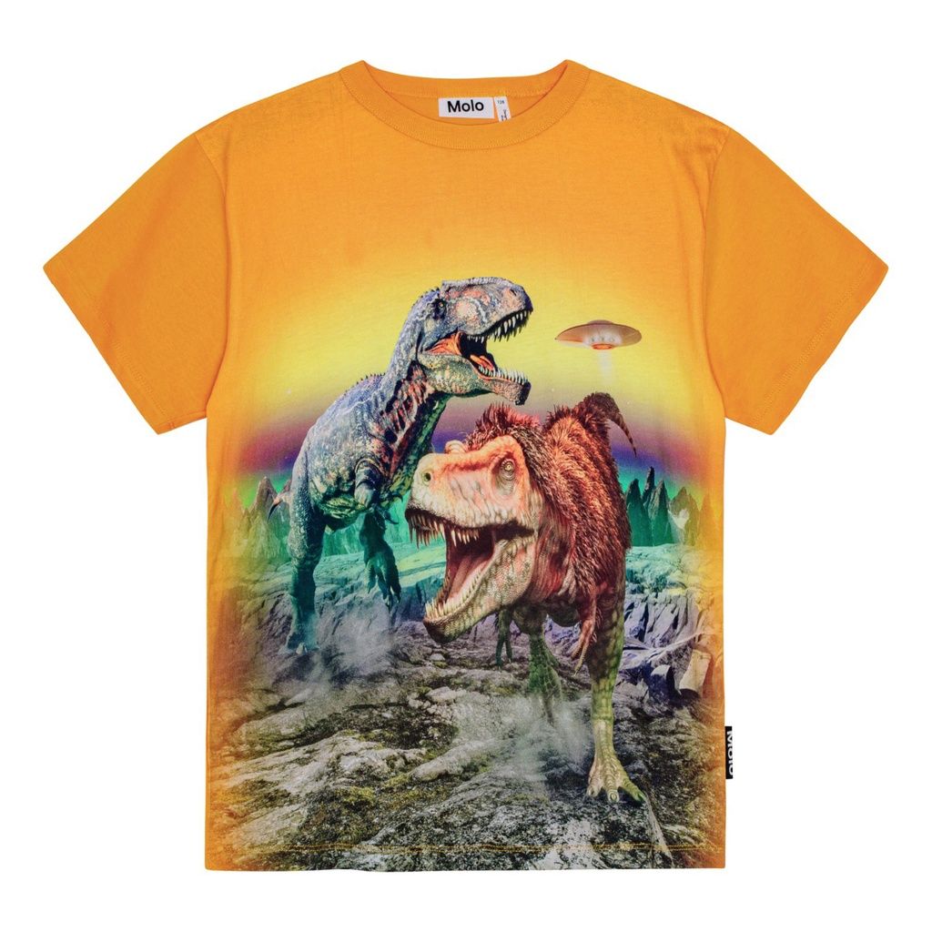 Oranges T-Shirt aus Öko-Baumwolle mit kurzen Ärmeln, Rundhalsausschnitt und geripptem Abschluss am Hals. Das T-Shirt hat eine lockere Passform und zeigt einen mehrfarbigen Druck von zwei Dinosauriern, die Fangen spielen, mit einem UFO.