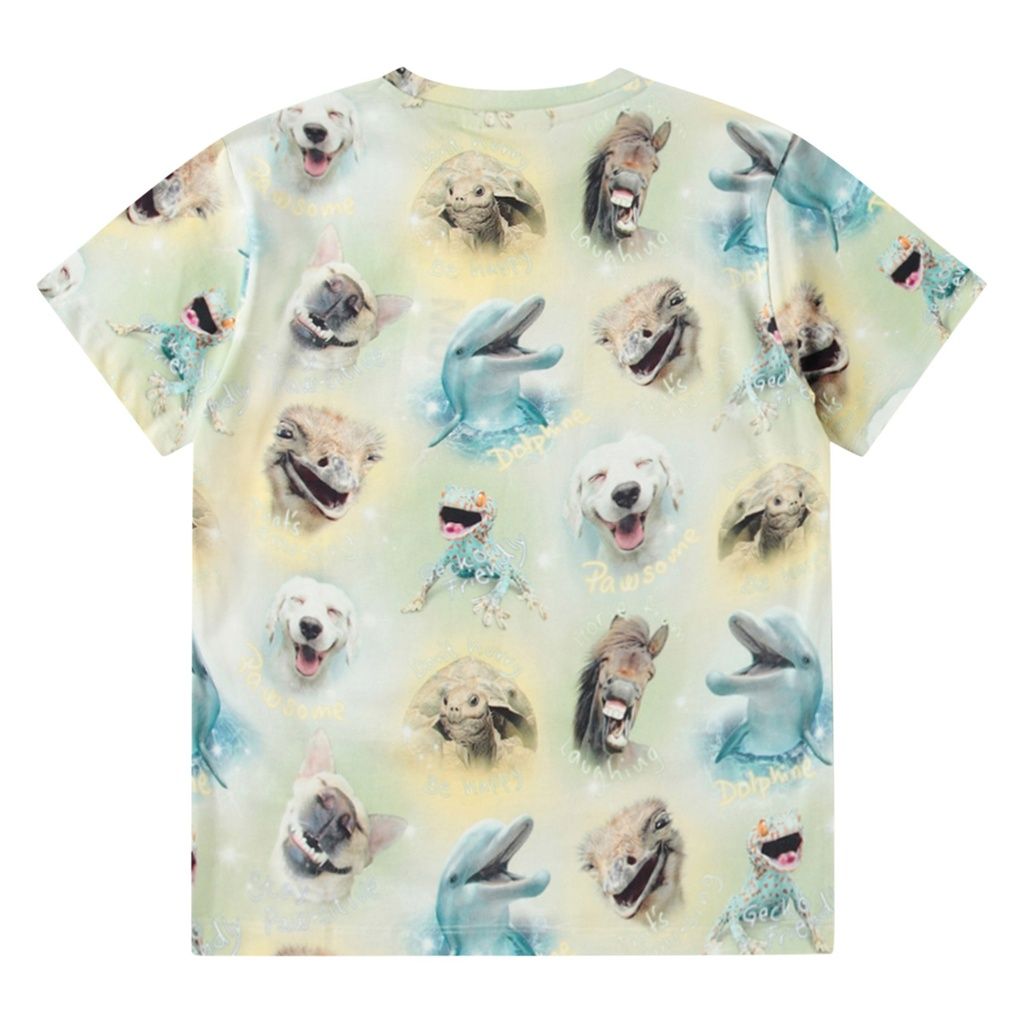 Dieses weiche T-Shirt aus GOTS-zertifizierter Öko-Baumwolle bringt gute Laune in den Kleiderschrank! Mit seinem beige-hellblauen Design, der lockeren Passform und dem gerippten Ausschnitt bietet es maximalen Tragekomfort. Der verspielte Allover-Print mit niedlichen, lächelnden Tieren macht es zum perfekten Begleiter für kleine Entdecker.