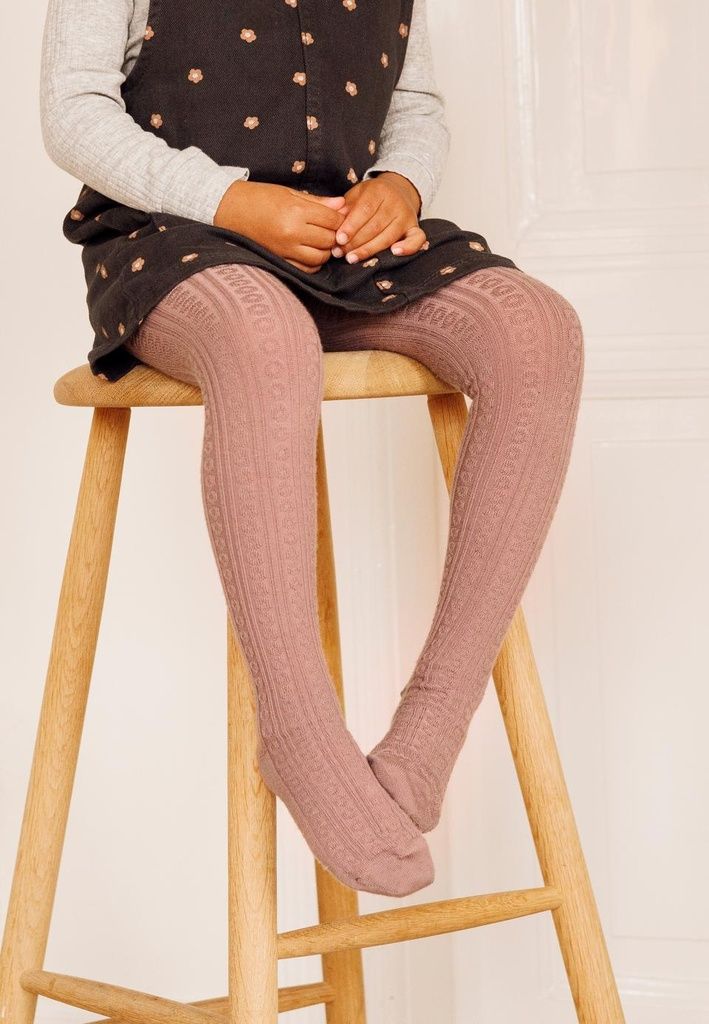 Hübsche Strumpfhose aus Superwash-Wolle. Die Strumpfhosen sind in einem schönen und femininen Muster gefertigt, das zwischen Rippenstruktur und Kreisen wechselt, was eine gute Passform in Kombination mit einem niedlichen Look gewährleistet.