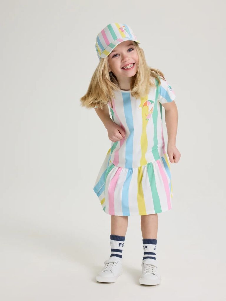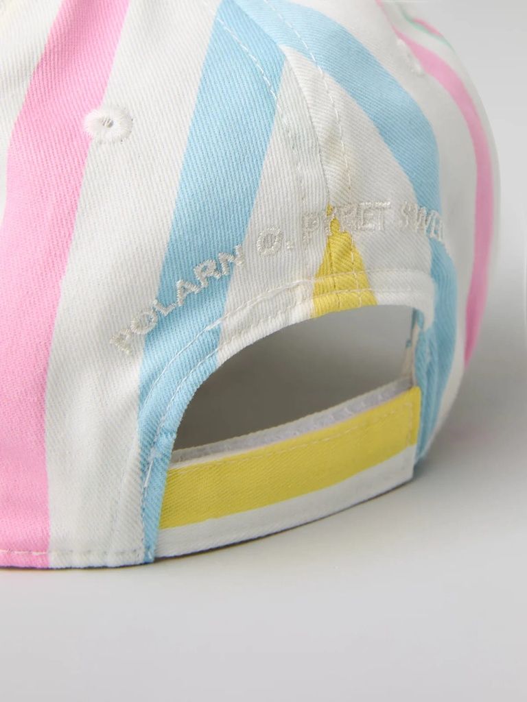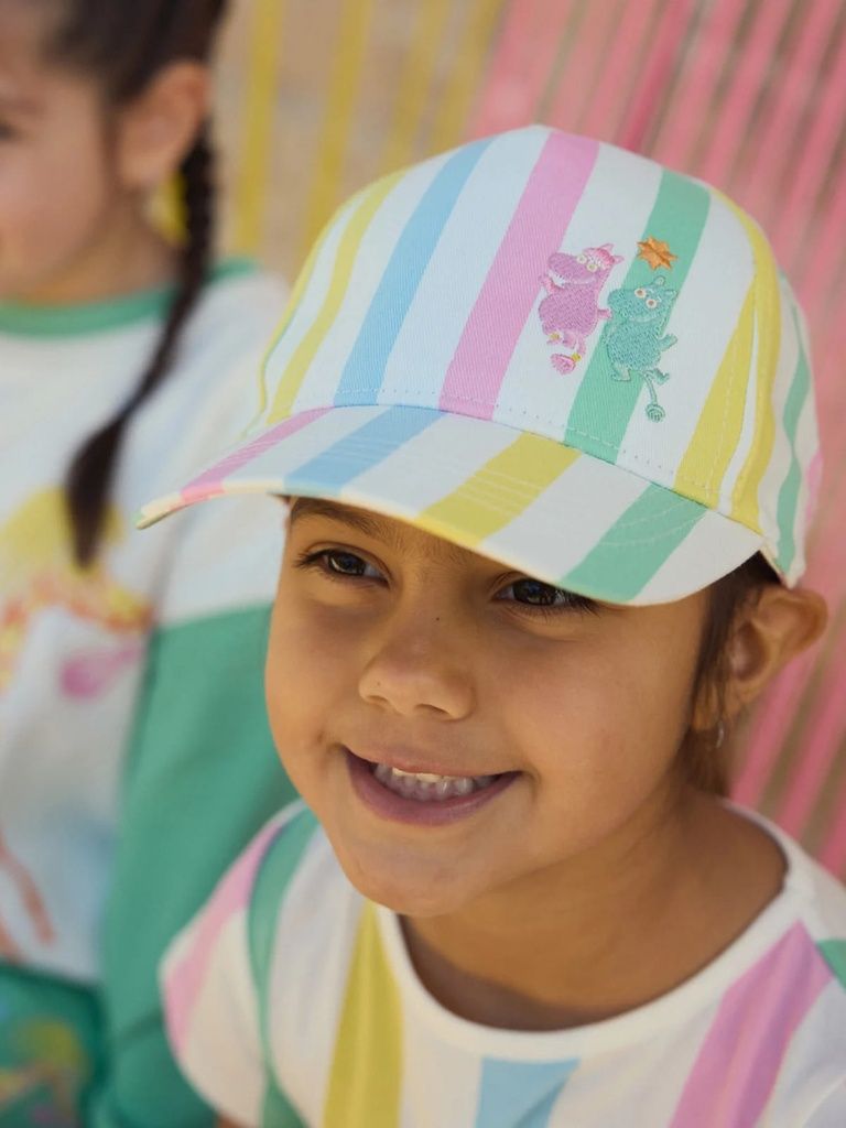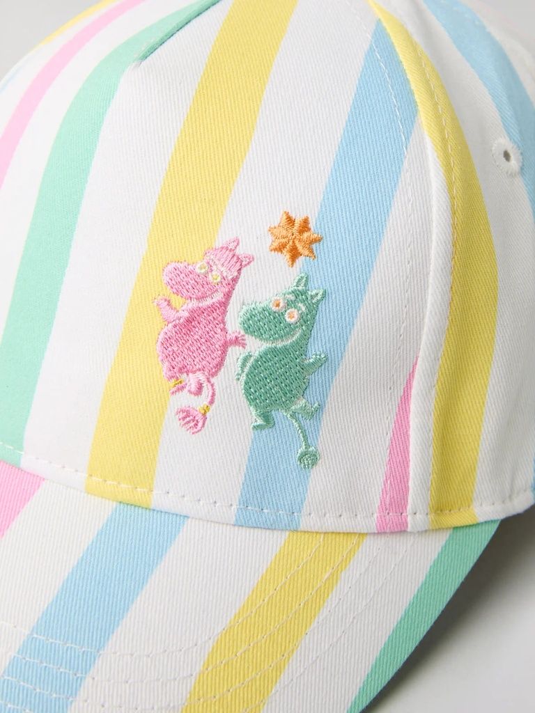 Klassische Kappe aus 100 % Bio-Baumwolle, bedruckt mit den Mumins aus dem Geschichten von Tove Jansson. Die Kappe hat umstickte Öffnungen für eine gute Luftzirkulation und die Grösse kann an der Rückseite mit Klettband reguliert werden.