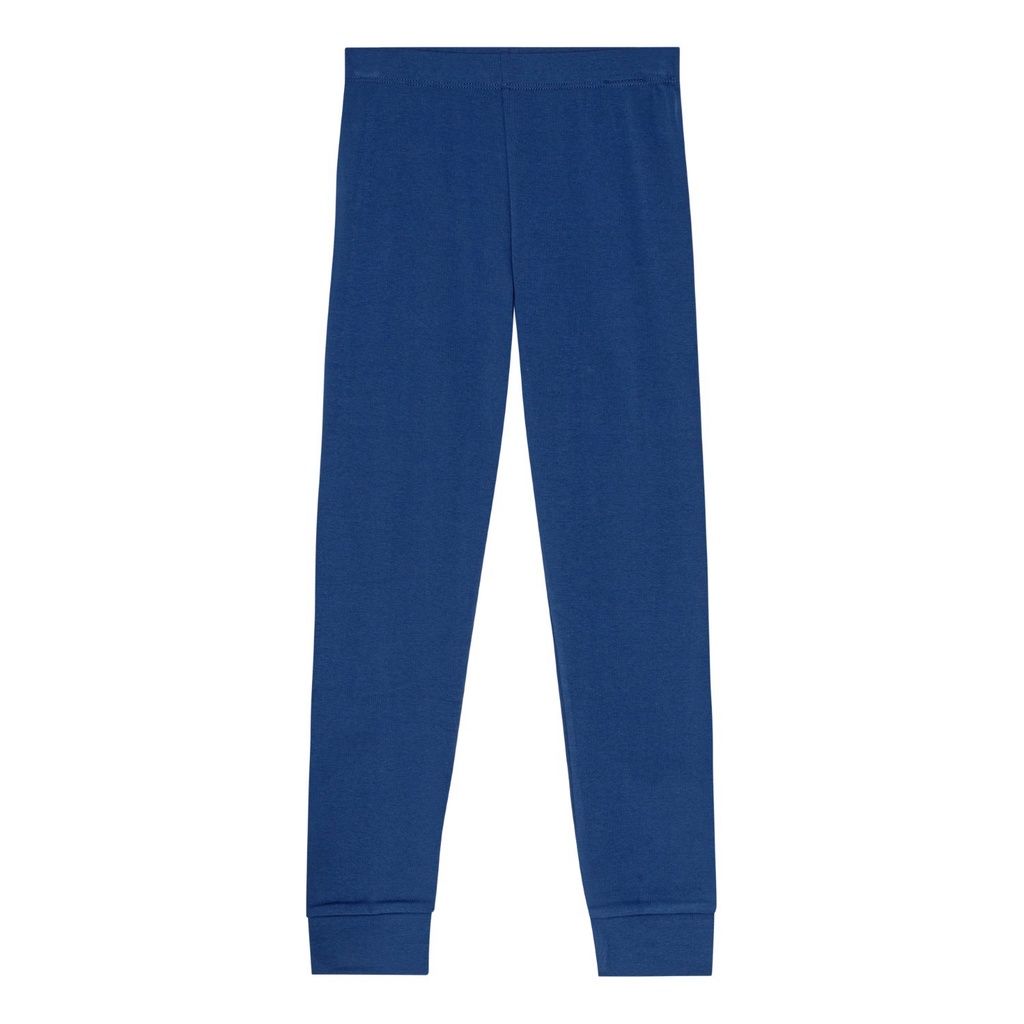 Pyjama-Set aus Öko-Baumwolle mit elastischem Bund und gerippten Bündchen an den Knöcheln. Das Oberteil hat einen Rundhalsausschnitt und ein grosses, mit weisser Farbe besprühtes Lächeln auf der Vorderseite.