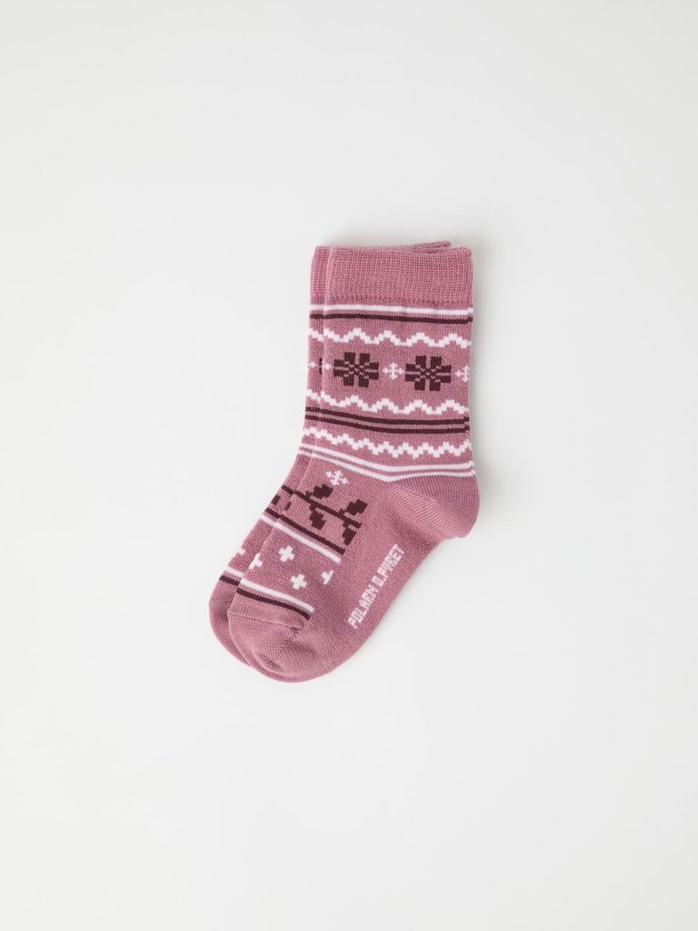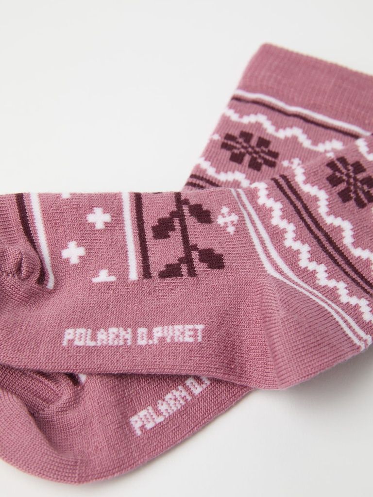 Söckchen mit Jacquardmuster aus dünner Merinowolle, die bequem an kleinen Füssen sitzen und angenehm wärmen. Die Grösse ist an der Innenseite des Schafts angegeben.