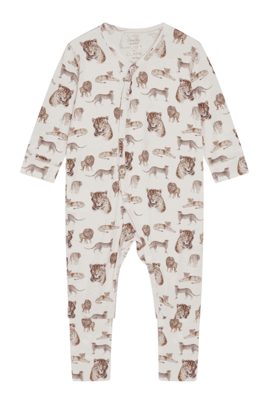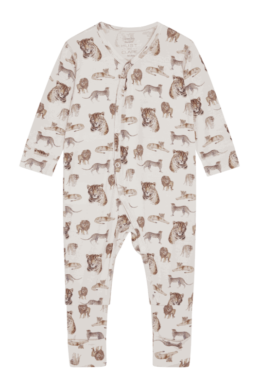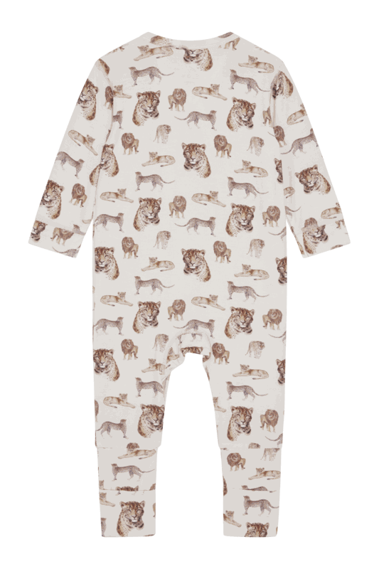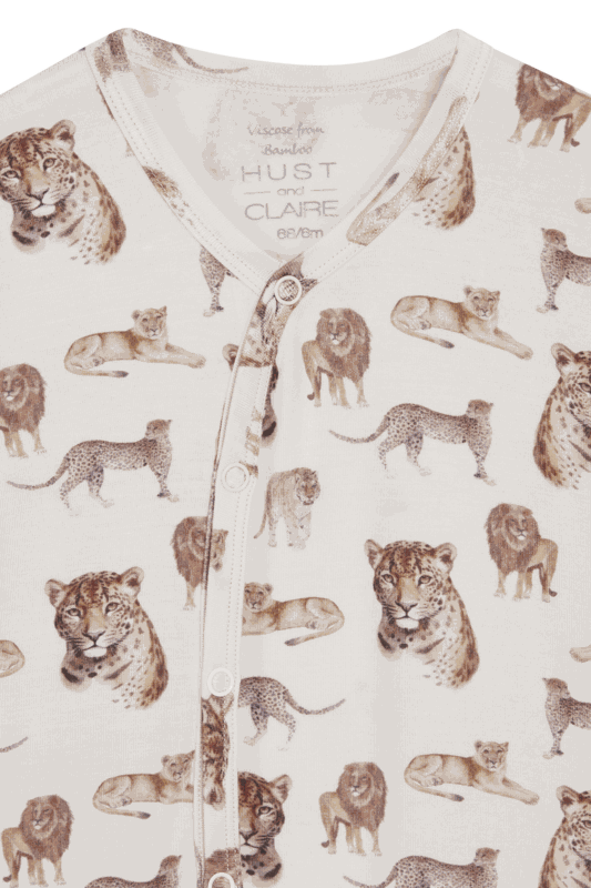 Langärmeliges Nachthemd aus weicher, dehnbarer Viskose aus Bambus mit einem Tier-Print. Dieser Einteiler kann dank dem asymmetrischen Knopfverschluss, der vom Hals bis zum linken Fuss verläuft, leichter geknöpft werden.