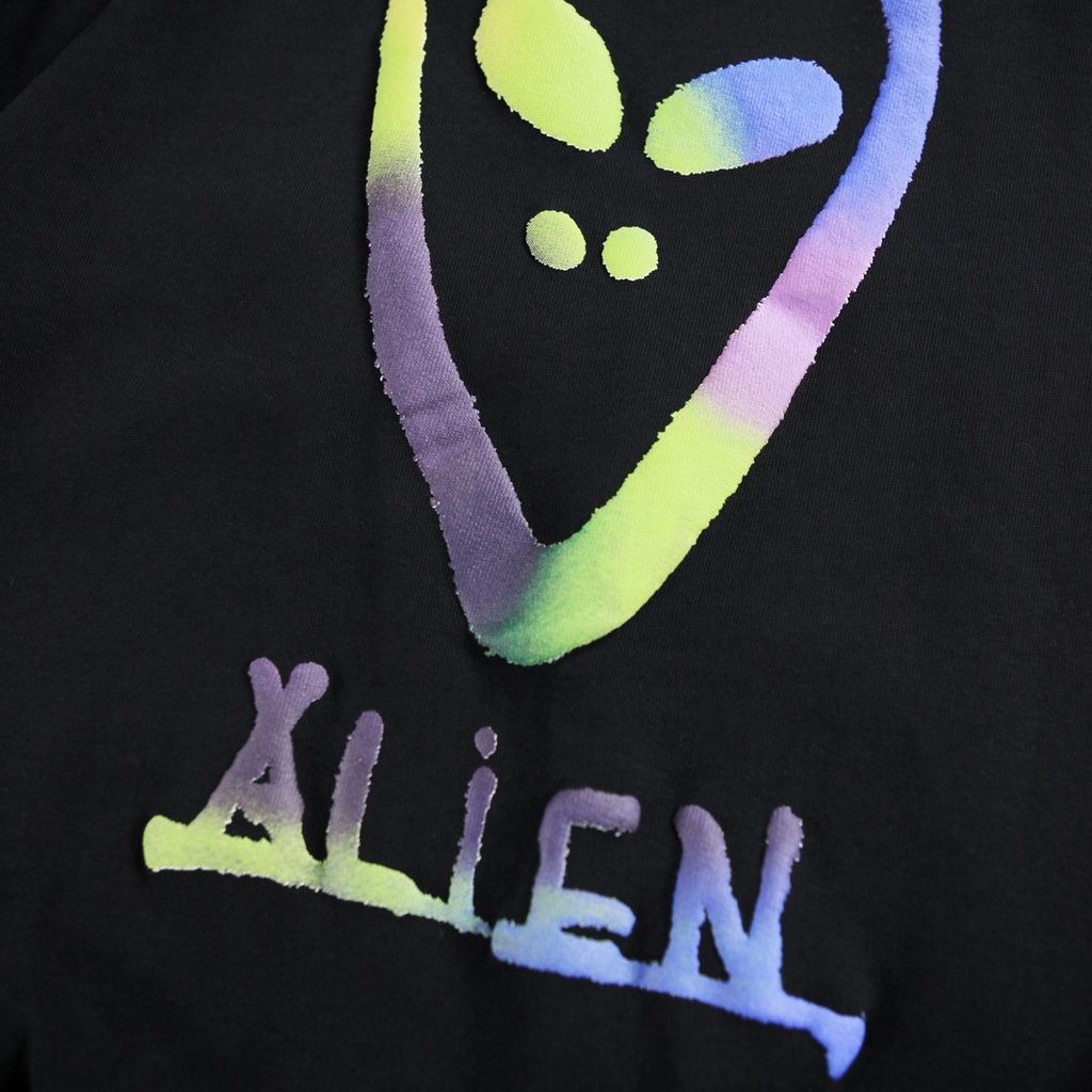 Der klassische Hoodie-Schnitt mit Kängurutasche, gerippten Bündchen und elastischem Saum sorgt für einen lässigen Sitz und angenehme Bewegungsfreiheit. Das Highlight ist der Alien-Print: ein kleiner Druck auf der Brust und ein grosses Motiv auf dem Rücken mit dem Schriftzug „Alien“.