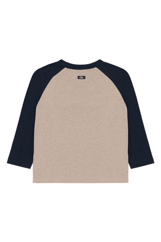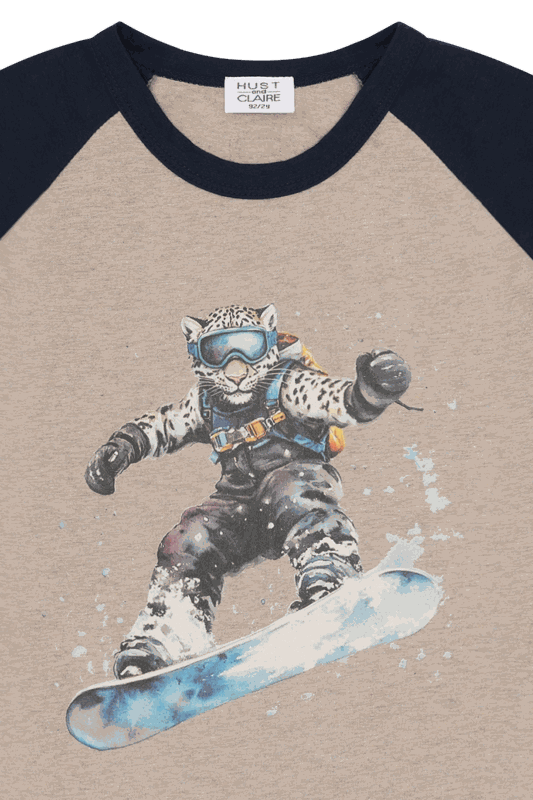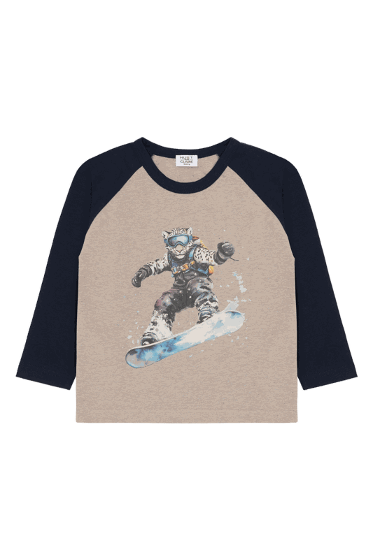 Die Beige-Dunkelblau-Kombination wird durch einen detaillierten Print eines snowboardenden Schneeleoparden auf der Vorderseite ergänzt, der dem Shirt ein dynamisches, verspieltes Element verleiht. Der Rundausschnitt mit Kontrastfarben rundet das moderne Design stilvoll ab.