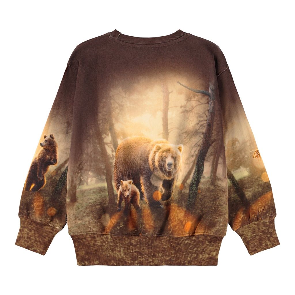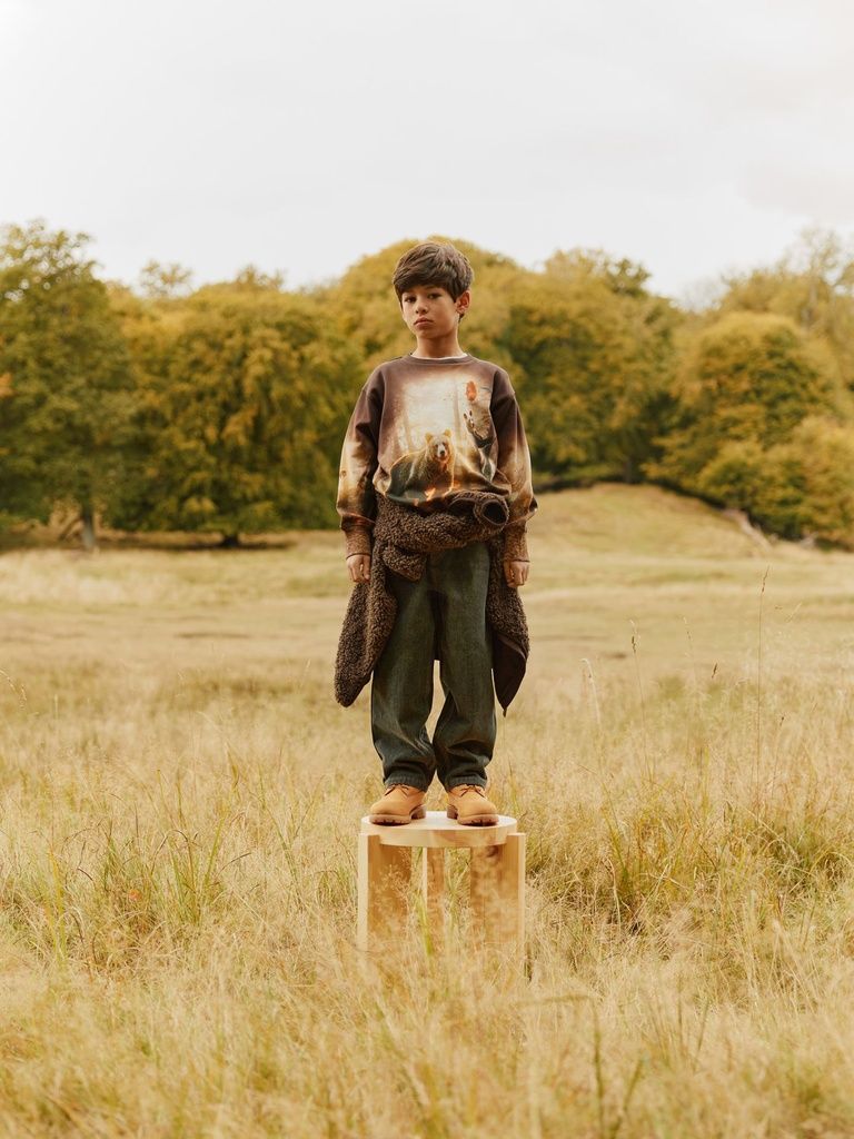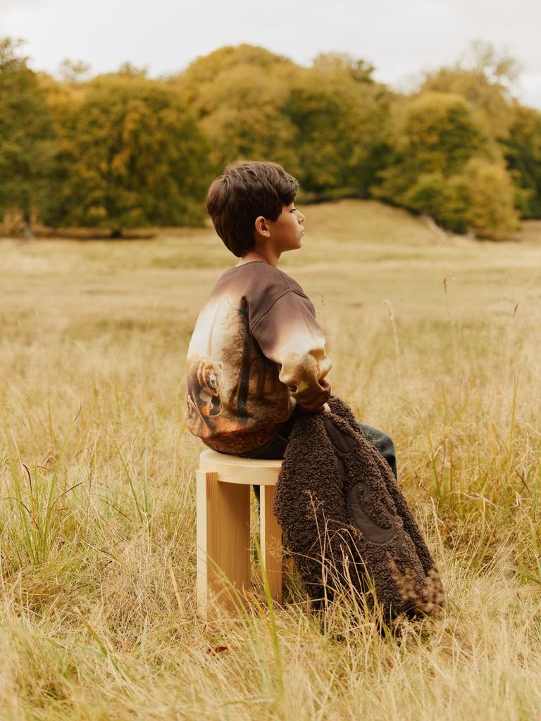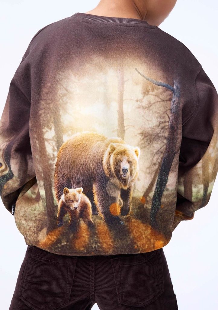 Ein Lieblingsstück für kleine Naturfreunde: Der braune Pullover aus weicher Öko-Baumwolle zeigt niedliche Honigbären im Allover-Print. Gerippte Abschlüsse an Hals, Ärmeln und Saum sorgen für eine gute Passform, während der angenehme Schnitt viel Bewegungsfreiheit lässt.