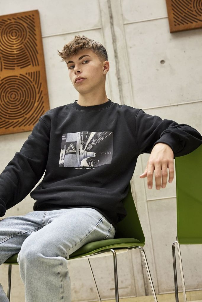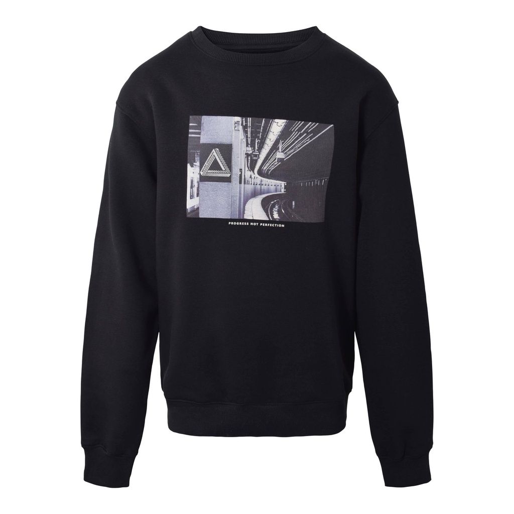 Smart Hound Sweatshirt in schwarzer Farbe mit einem stilvollen Druck einer U-Bahn-Station und dem Text „PROGRESS NOT PERFECTION“ auf der Vorderseite. Das Sweatshirt hat lange Ärmel und ist perfekt für einen lässigen Style.