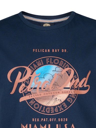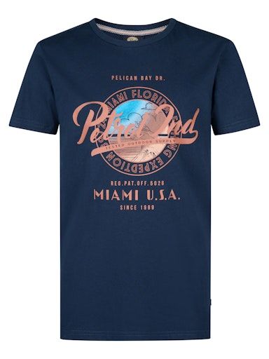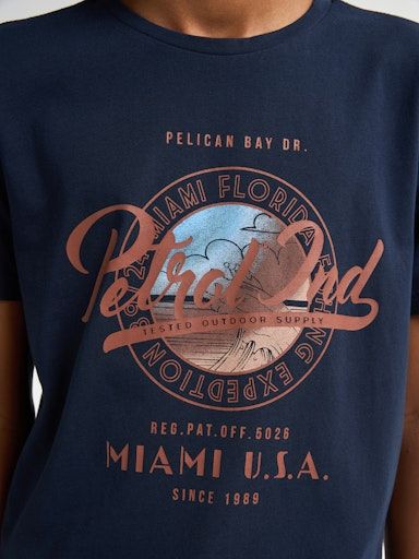 Bequemes T-Shirt mit Rundhalsausschnitt, kurzen Ärmeln und normaler Passform für einen klassischen Look. Das T-Shirt hat einen auffälligen Petrol-Logo-Print auf der Brust und besteht aus 100% Baumwolle.