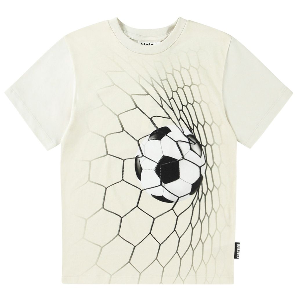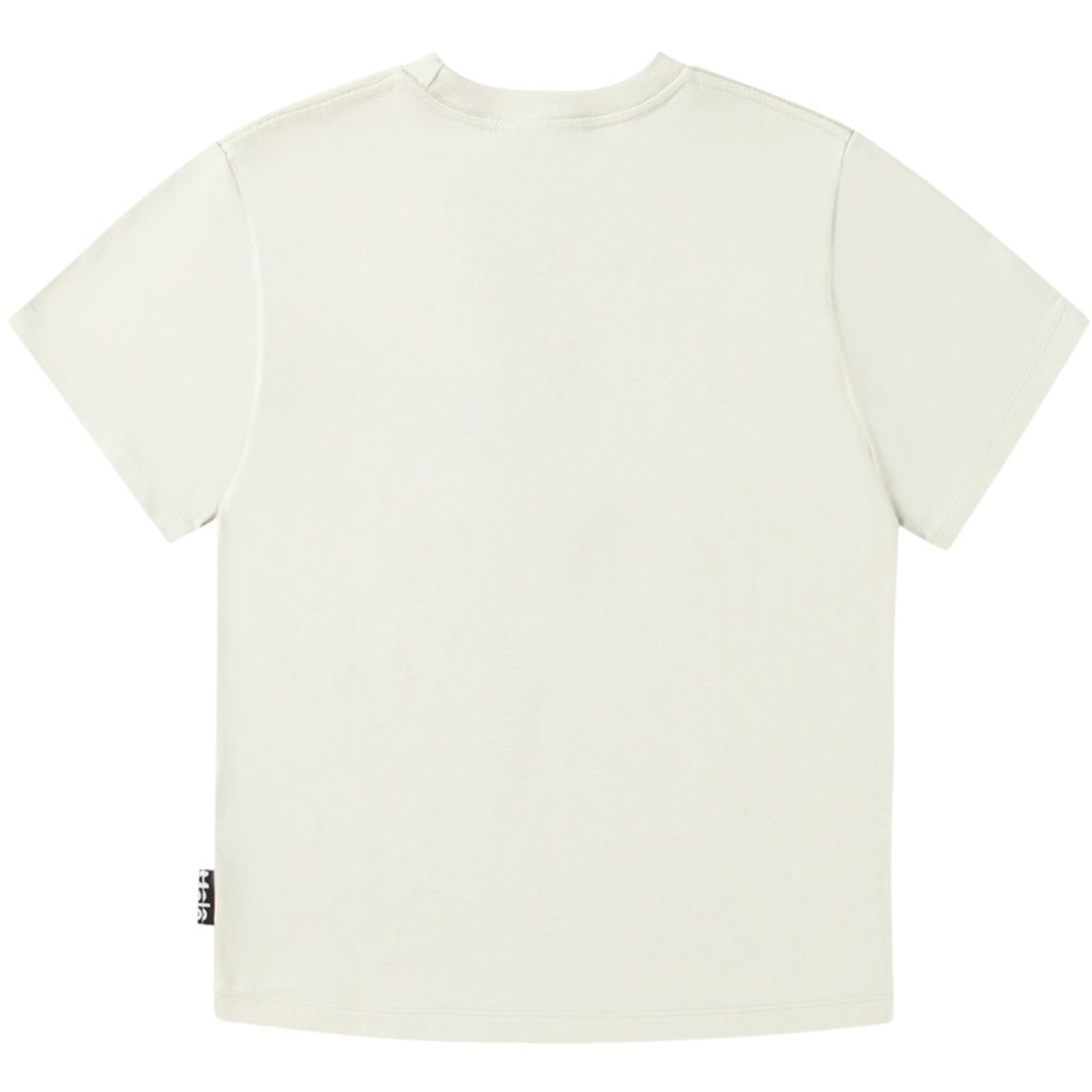 Weisses T-Shirt aus Öko-Baumwolle mit kurzen Ärmeln, Rundhalsausschnitt und geripptem Besatz am Hals. Das T-Shirt hat eine lockere Passform und einen positionierten Druck auf der Vorderseite.