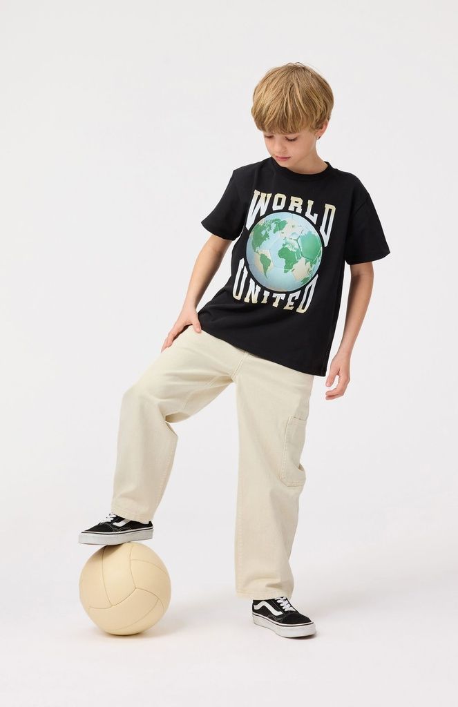 T-Shirt aus weicher Öko-Baumwolle mit kurzen Ärmeln und geripptem Ausschnitt. Das T-Shirt hat eine lockere Passform und einen Frontdruck eines hellblauen Fussballs mit einer Weltkarte und dem Text 'World United'.