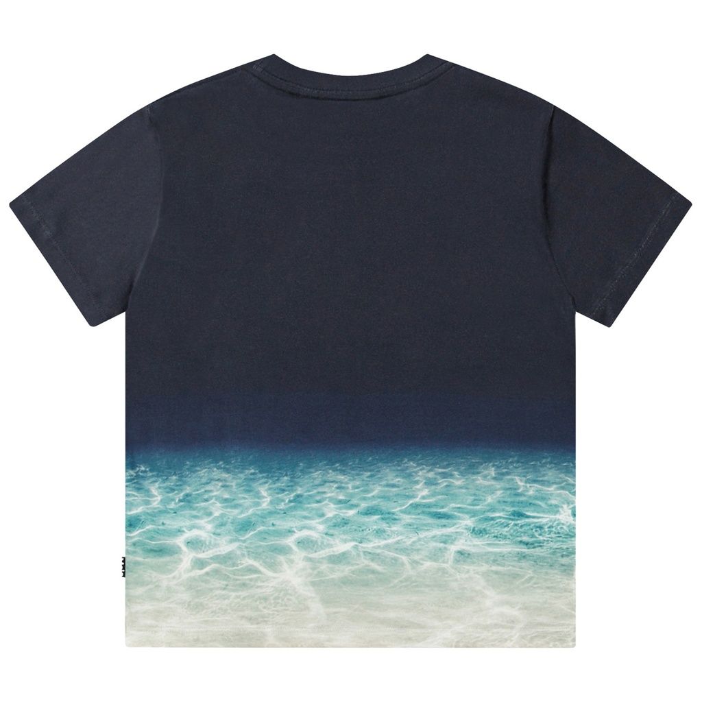 Dunkelblaues T-Shirt aus Öko-Baumwolle mit kurzen Ärmeln und geripptem Ausschnitt. Das T-Shirt hat eine lockere Passform und einen Aufdruck eines Haies im Meer.