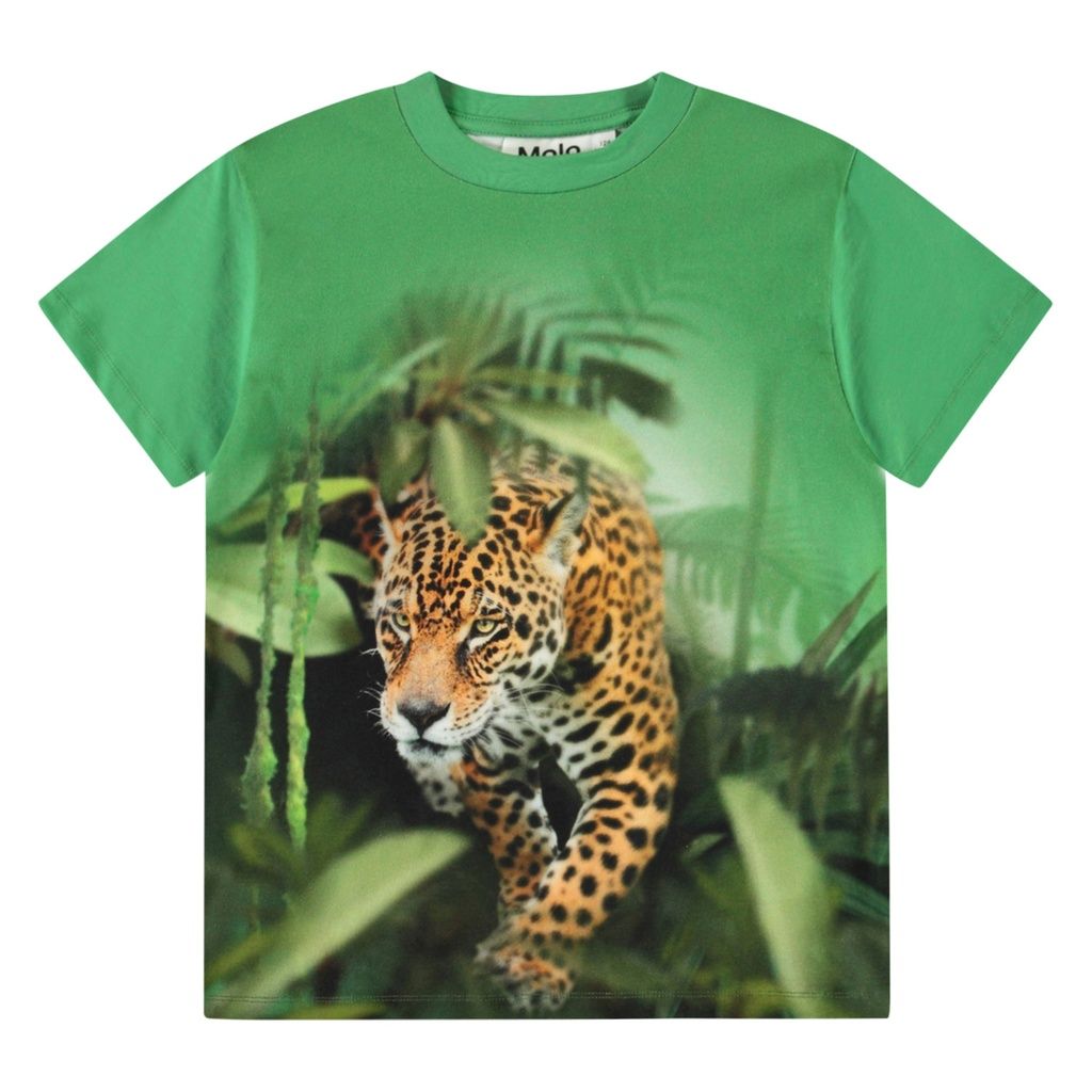 Grünes T-Shirt aus weicher Öko-Baumwolle mit kurzen Ärmeln und geripptem Ausschnitt. Das T-Shirt hat eine lockere Passform mit einem Druck eines Geparden im Dschungel, der auf der Rückseite mit einem schwarzen Geparden lauert.