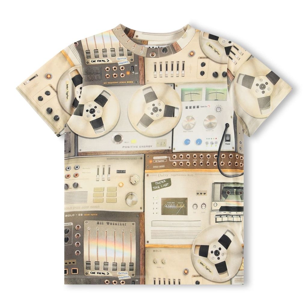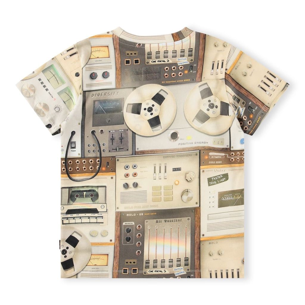 Für kleine Musik- und Technikfans: Dieses T-Shirt von Molo verbindet Komfort mit coolem Retro-Look. Hergestellt aus weicher Bio-Baumwolle bietet es ein angenehmes Tragegefühl, während die normale Passform Bewegungsfreiheit für Alltag, Schule oder Freizeit garantiert. Der bräunliche Aufdruck mit alten Mischpulten verleiht dem T-Shirt einen besonderen Vintage-Charme.