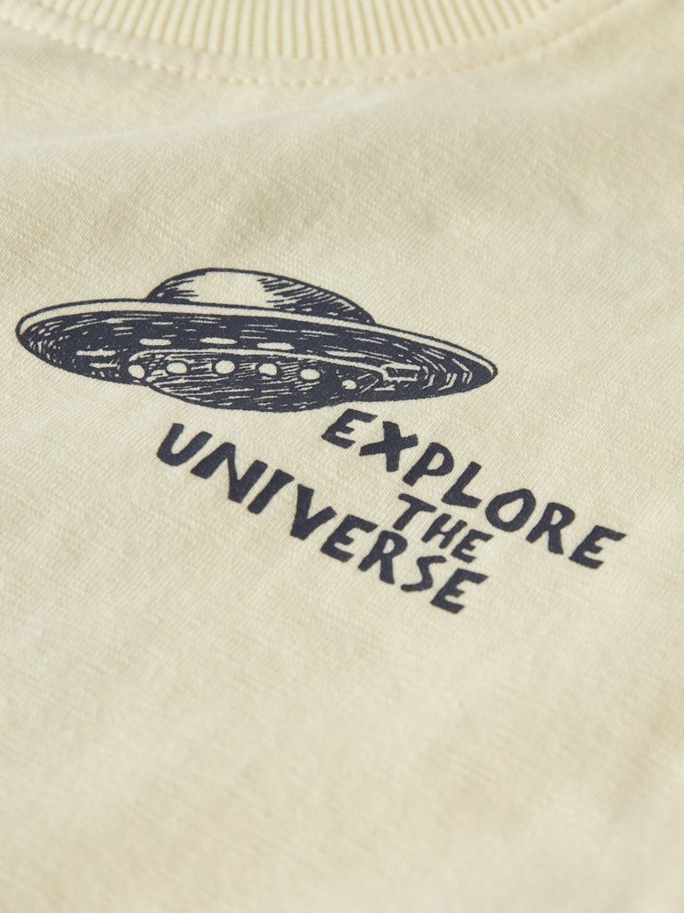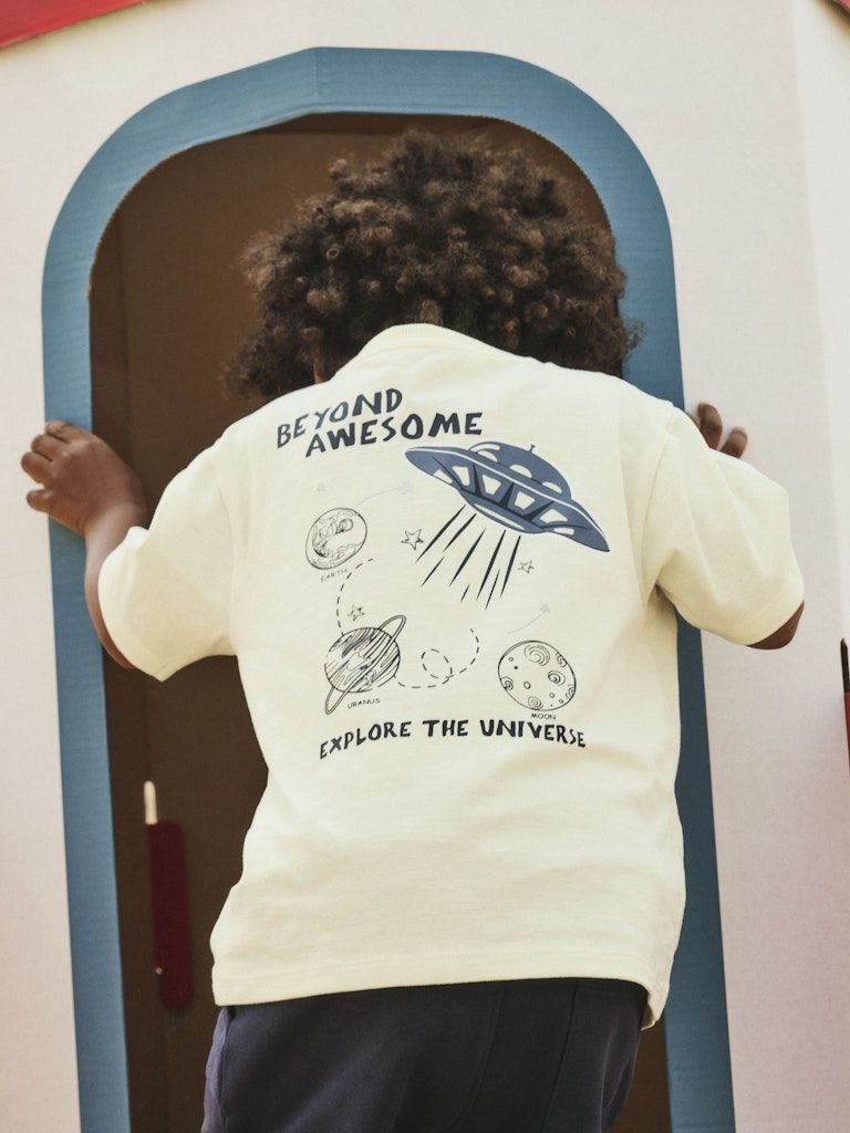 Der Rundhalsausschnitt, die kurzen Ärmel und die normal geschnittene Passform sorgen für einen bequemen Sitz. Der Print kombiniert Folienprint mit glänzender Optik und Gummidruck für zusätzliche Weichheit - ein cooler Mix aus Look und Komfort. Das Hauptmaterial besteht zu mindestens 50 % aus Bio-Baumwolle.