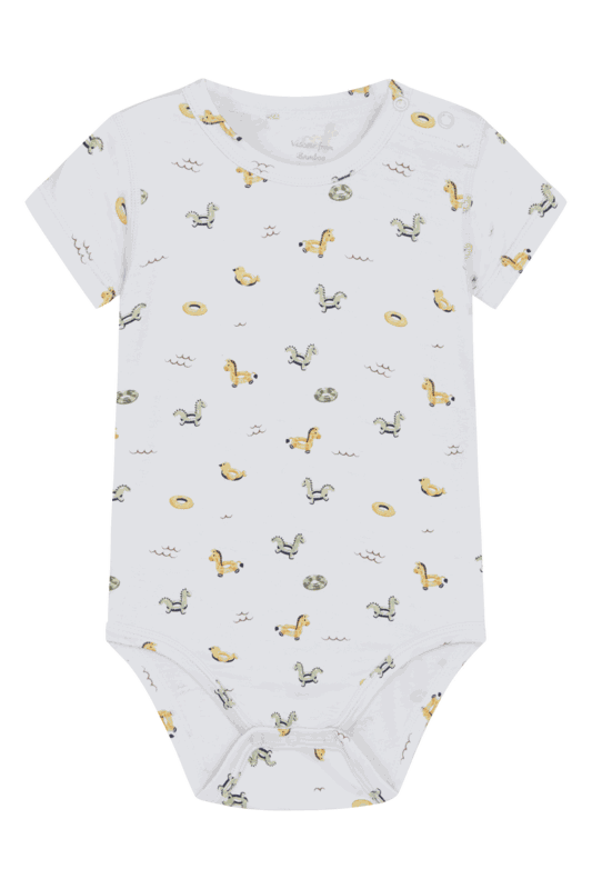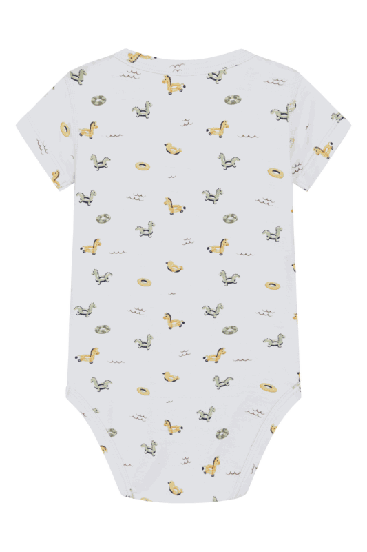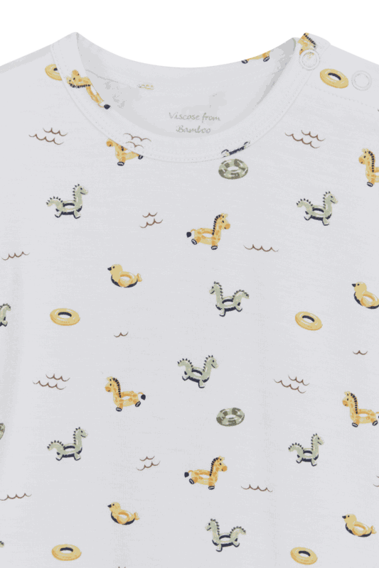 Kurzärmeliger Body aus weicher, dehnbarer Viskose aus Bambus mit einem Print, der Badetiere darstellt. Es ist an der linken Schulter und zwischen den Beinen mit Knopfverschlüssen ausgestattet.