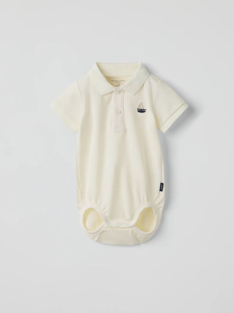 Der feine Kragen und die Knopfleiste verleihen dem Body eine elegante Note, während das kleine, gestickte Segelboot auf der Brust für einen charmanten Hingucker sorgt. Gerippte Ärmelbündchen garantieren eine bequeme Passform, und praktische Druckknöpfe im Schritt machen das Windelwechseln unkompliziert.