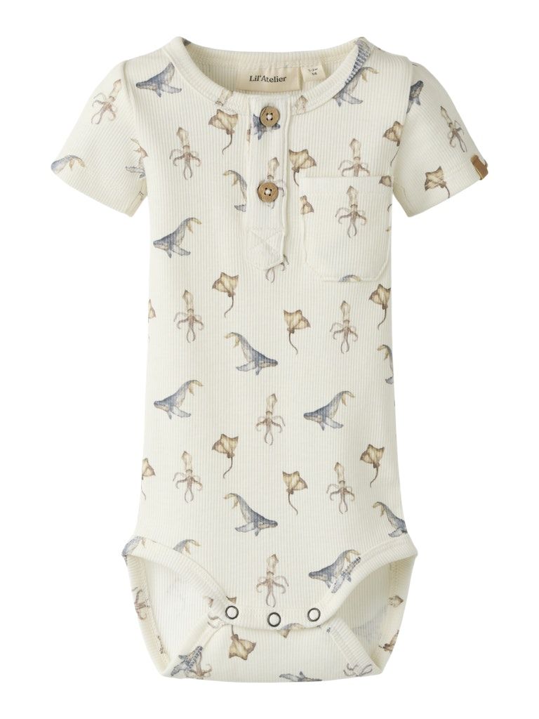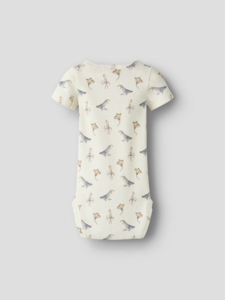 Der gerippte Strick mit Längsstreifenmuster ist elastisch und bietet eine optimale Passform. Der Body verfügt über kurze Ärmel, einen Rundhals und eine praktische Knopfleiste, während der Druckknopfverschluss im Schritt das An- und Ausziehen sowie den Windelwechsel erleichtert. Eine Brusttasche rundet das Design funktional ab, und der ganzflächige Print sorgt für einen verspielten Look.