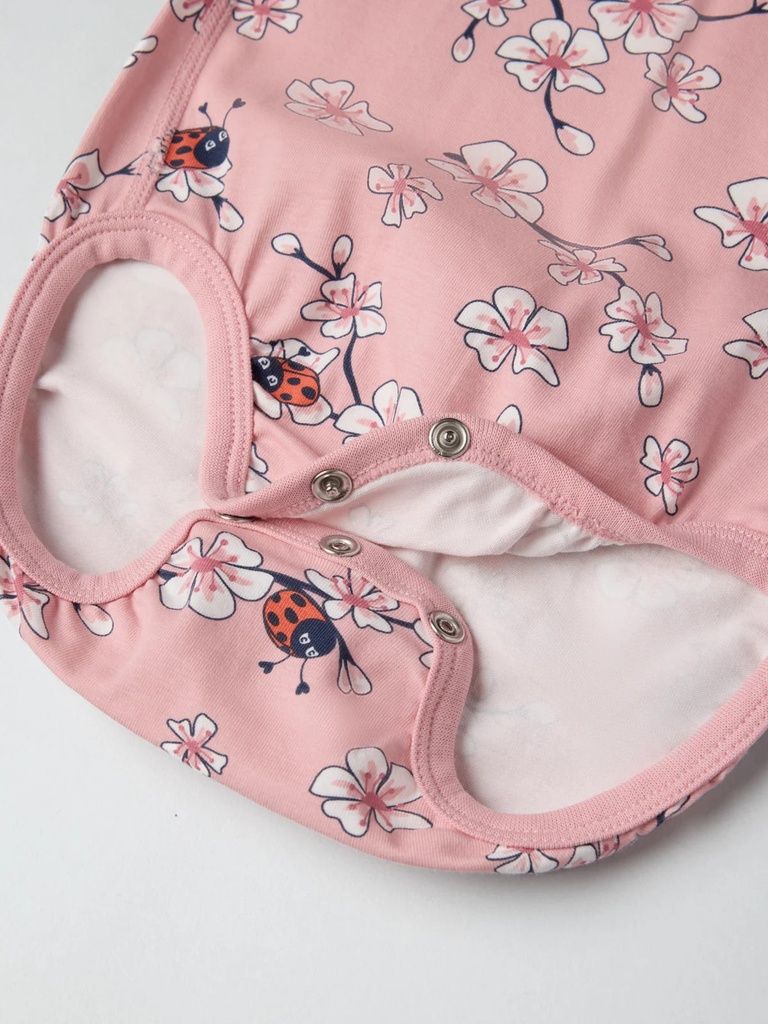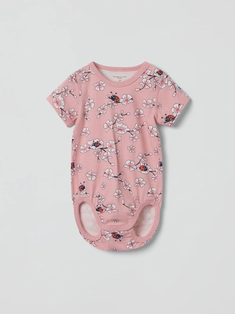 Kurzärmliger Body aus weicher Bio-Baumwolle mit besonders weichen, flachen Nähten, die wunderbar sanft zu empfindlicher Haut sind. Der Body ist durchgehend mit Blumen bedruckt.