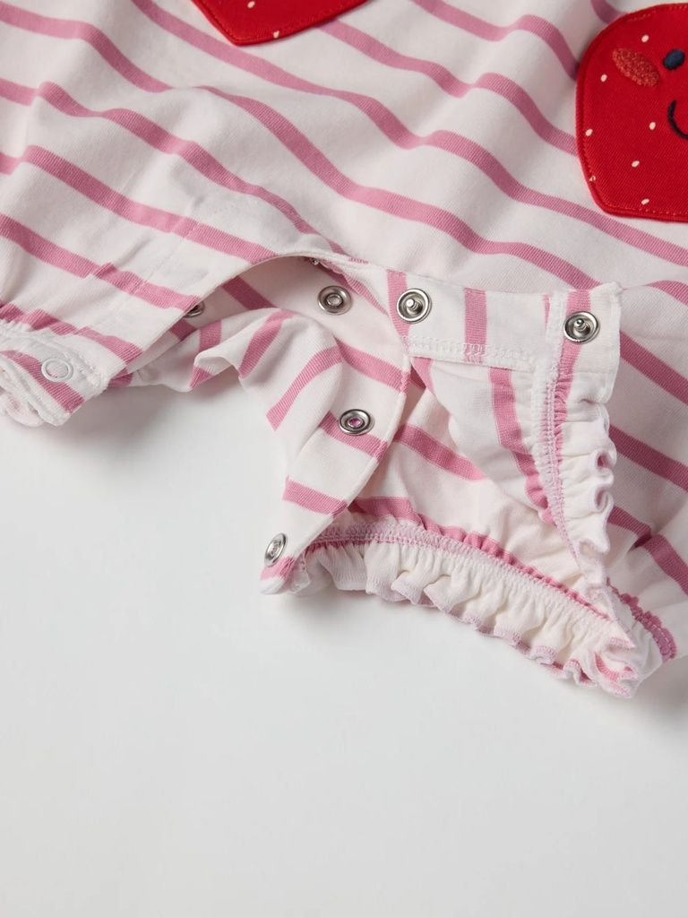 So süss wie der Sommer selbst – dieser gestreifte Playsuit aus weichem Bio-Baumwolltrikot ist ein echtes Highlight in der Babygarderobe! Die verspielten Erdbeer-Taschen auf der Vorderseite sorgen für einen fruchtigen Hingucker und machen das Outfit zu einem kleinen Kunstwerk.