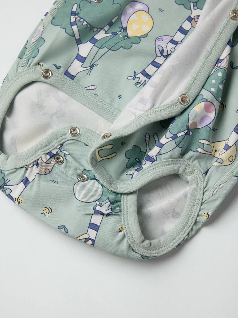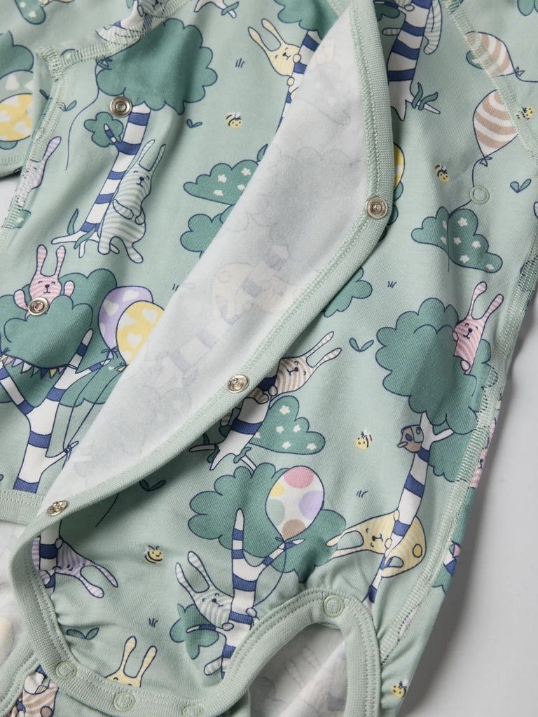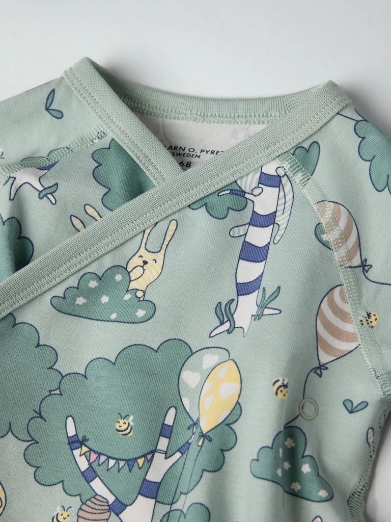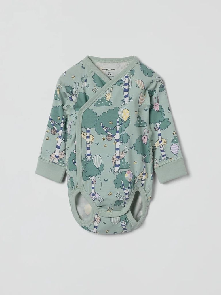 Dieser verlängerbare Wickelbody mit verspieltem Waldprint ist die perfekte Wahl für umweltbewusste Eltern, die Wert auf Komfort und Langlebigkeit legen. Dank der zusätzlichen Druckknopf-Reihe im Schritt und den umschlagbaren Ärmelbündchen wächst der Body einfach mit – für eine längere Tragezeit und mehr Nachhaltigkeit!