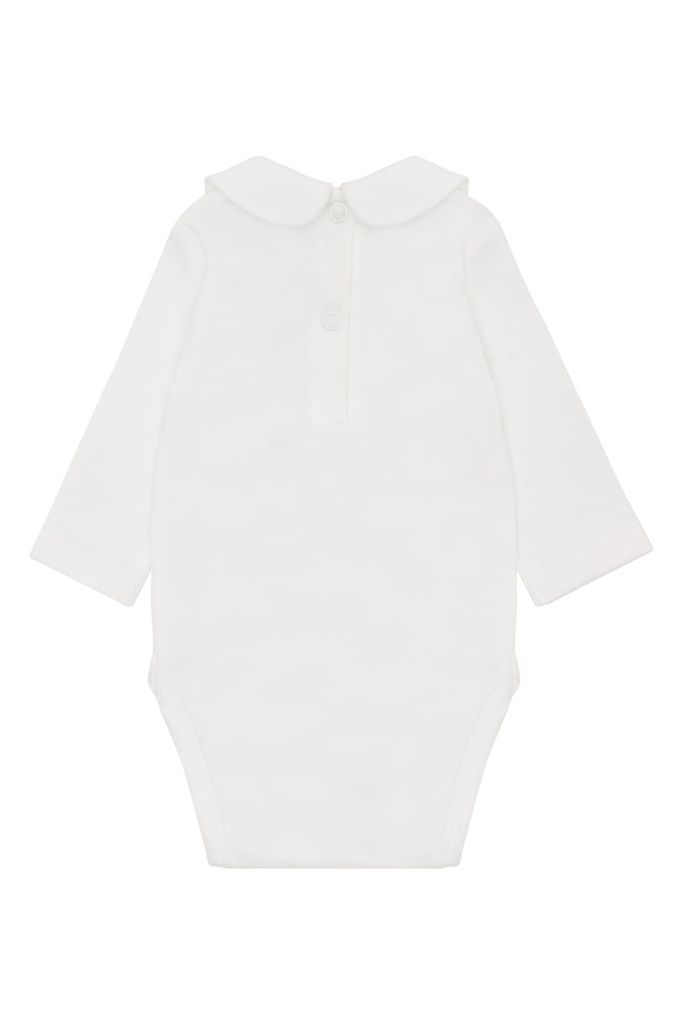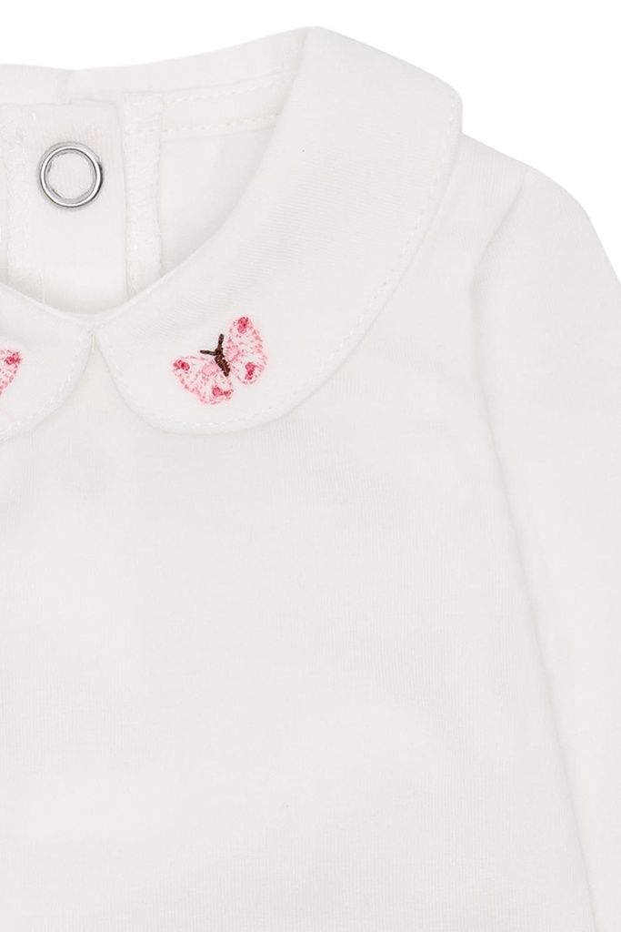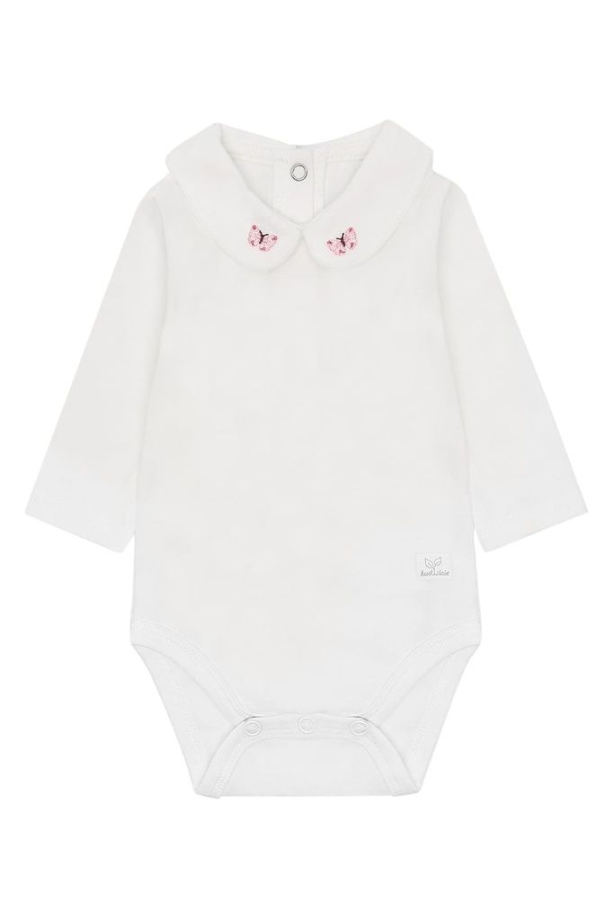Die feinen, gestickten Schmetterlinge am Kragen verleihen dem Design eine verspielte, zarte Note. Praktische Druckknöpfe am Rücken sowie zwischen den Beinen erleichtern das An- und Ausziehen und machen das Wickeln unkompliziert.