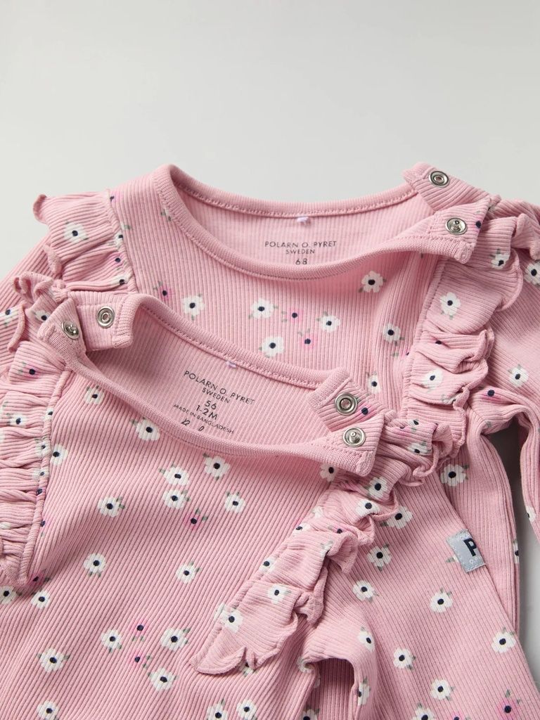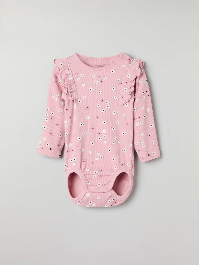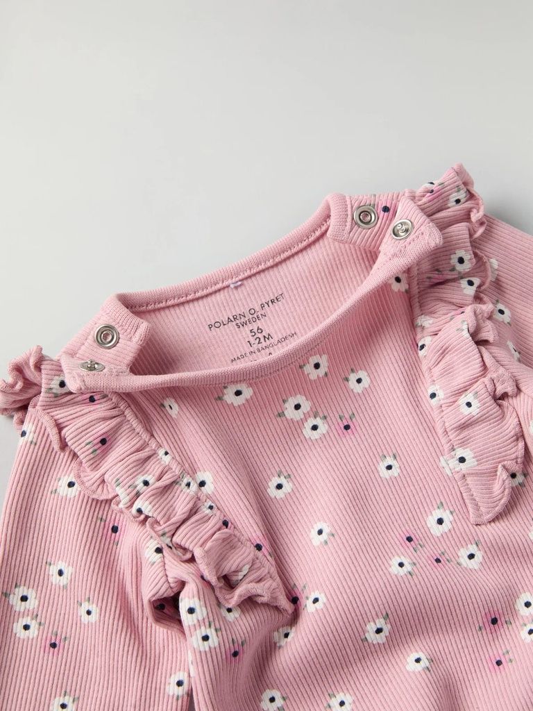 Gerippter Body aus weichem Bio-Baumwolltrikot für Babys. Mit niedlichem Blumenprint und Rüschen über den Schultern, die sich über den Rücken fortsetzen.