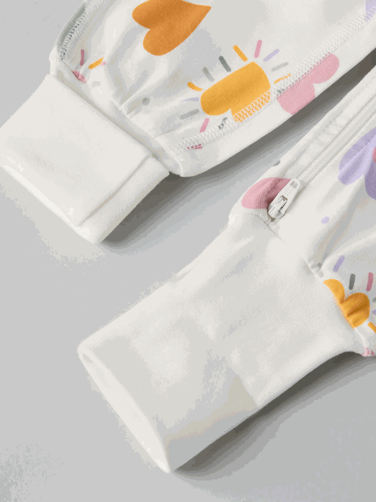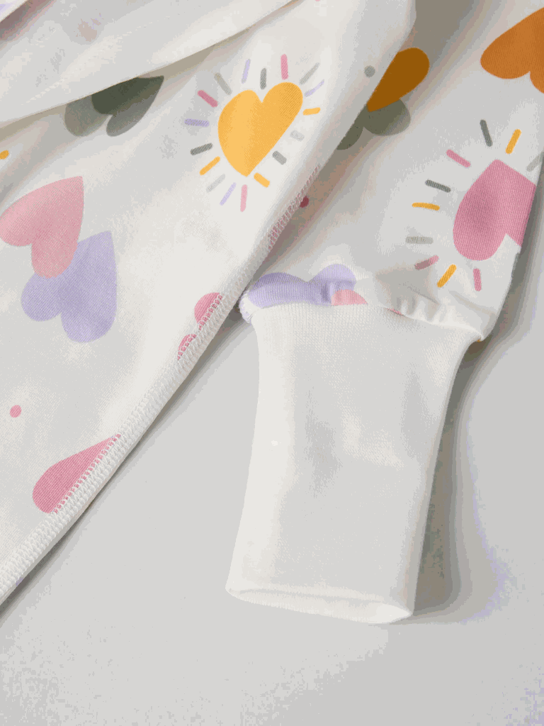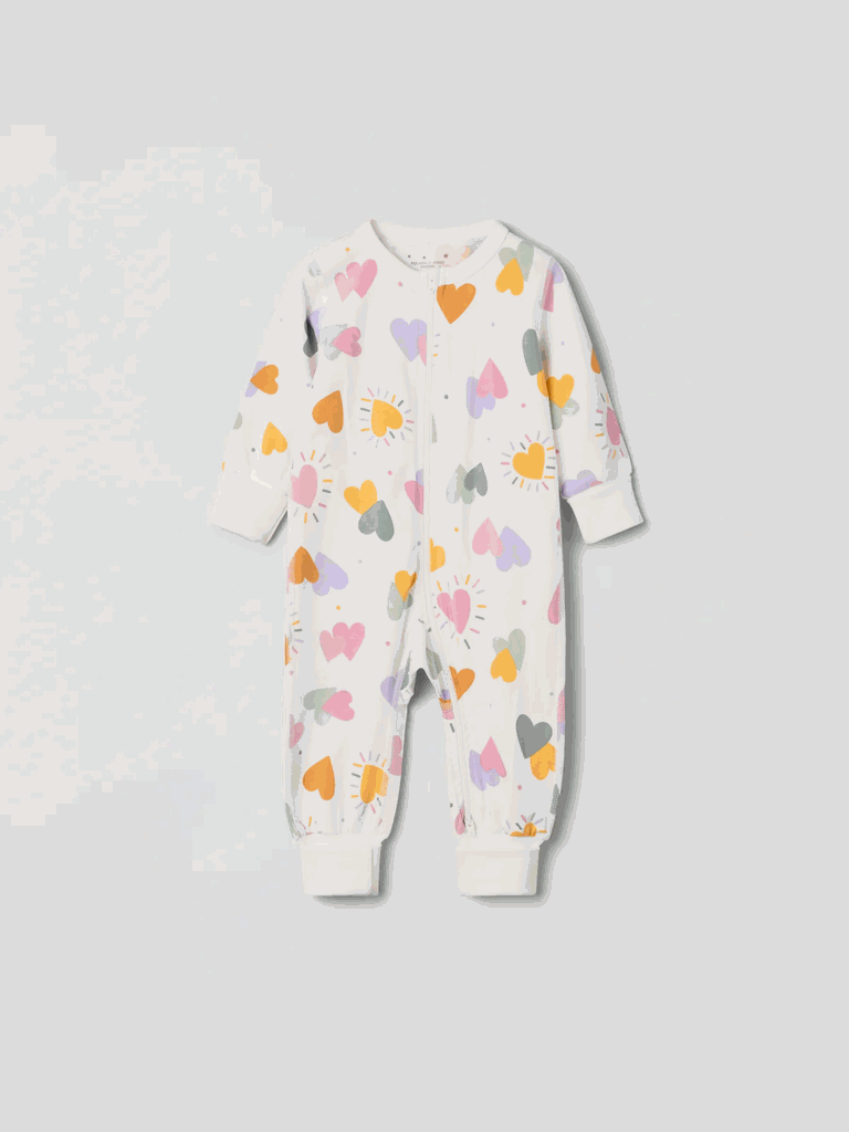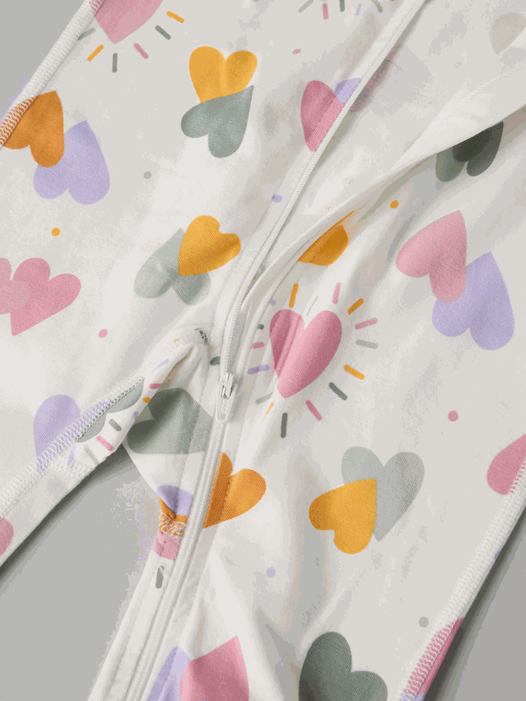 Schlafoverall aus weicher Bio-Baumwolle mit besonders weichen, flachen Nähten, die sanft zu empfindlicher Haut sind. Der Overall ist durchgehend mit Herzchen bedruckt.