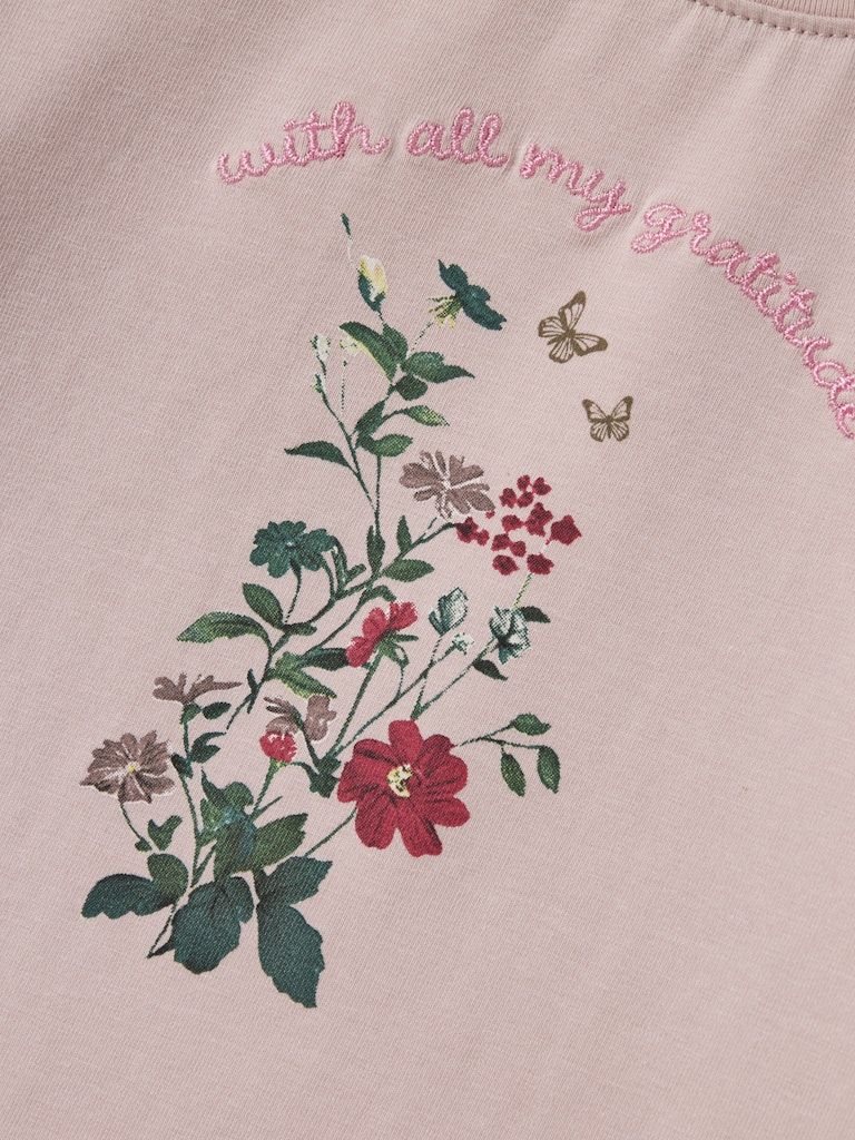 Der weiche Jersey-Stoff sorgt mit seiner angenehmen Dehnbarkeit für volle Bewegungsfreiheit und liegt sanft auf der Haut. Feine Stickereien und ein weicher Gummiprint setzen dezente Highlights und verleihen dem Shirt das gewisse Etwas.
