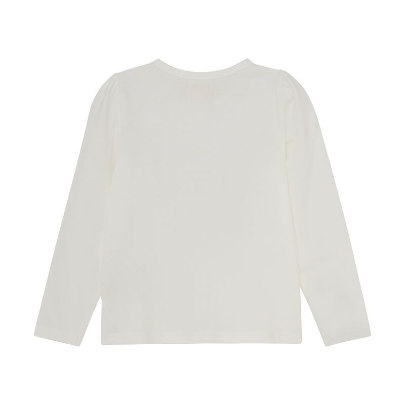 Schöne cremefarbene Bluse von Creamie. Es hat einen Rüscheneffekt an den Schultern und einen Aufdruck aus Herzen in verschiedenen Farben auf der Brust.