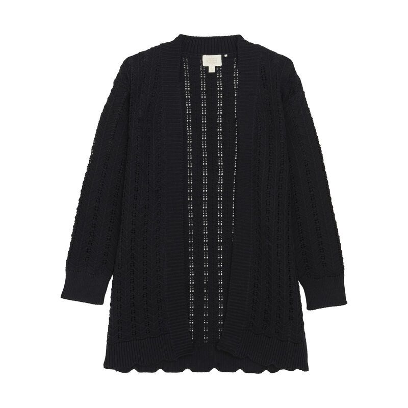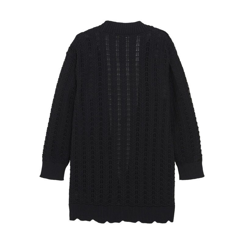 Schöne warme, lange Strickjacke von Creamie. Die Strickjacke ist im feinen Pointelle-Muster gestrickt und hat unten einen gewellten Rand.