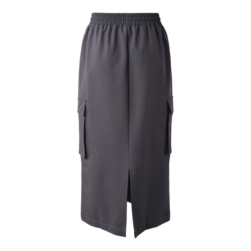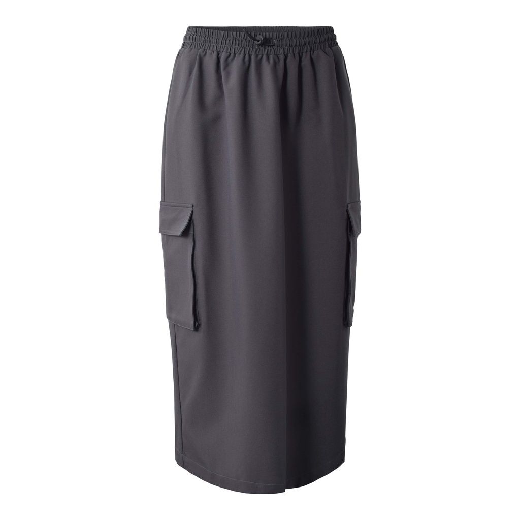 Cargo-Rock mit Knopf und Reissverschluss. Der Rock hat zwei Seitentaschen und einen verstellbaren, elastischen Bund. Cargo-Taschen an den Seiten.