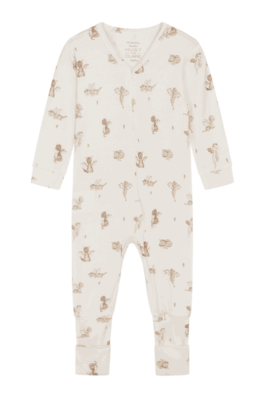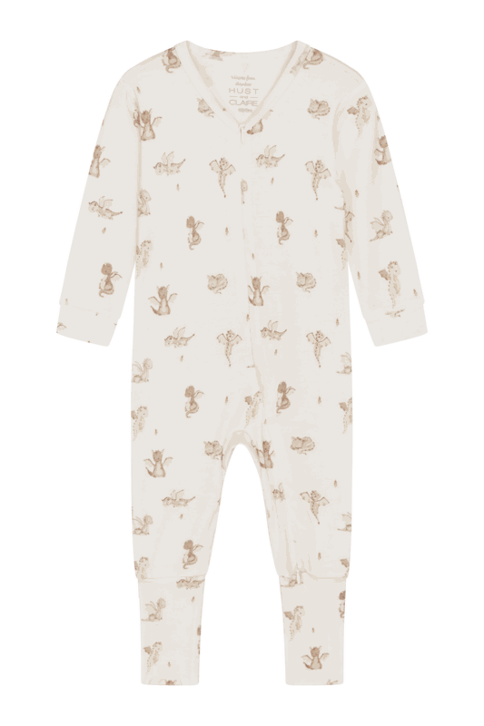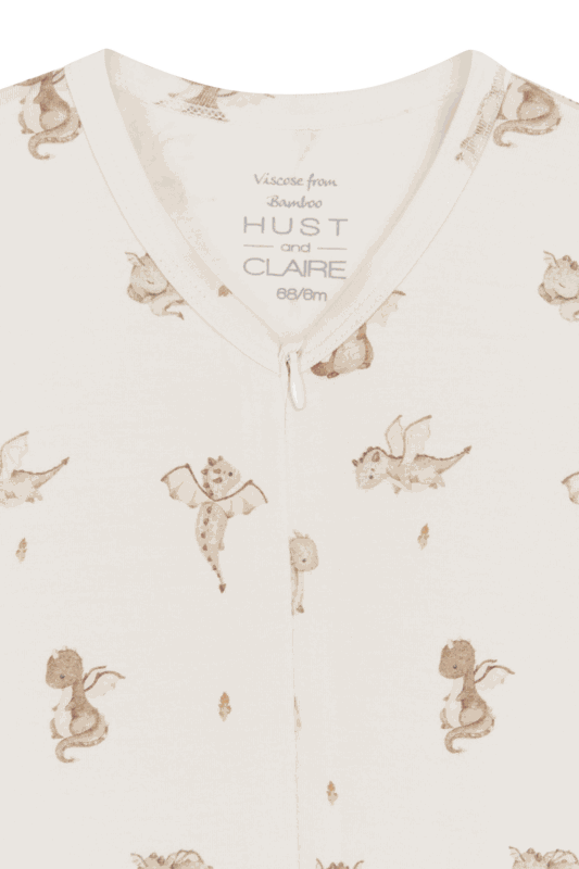 Langärmeliger Schlafanzug aus weicher, dehnbarer Viskose aus Bambus und mit einem Dinosaurier-Print. Dieser Einteiler verfügt über einen leicht asymmetrischen Reissverschluss, der vom Hals abwärts bis zum linken Fuss verläuft.