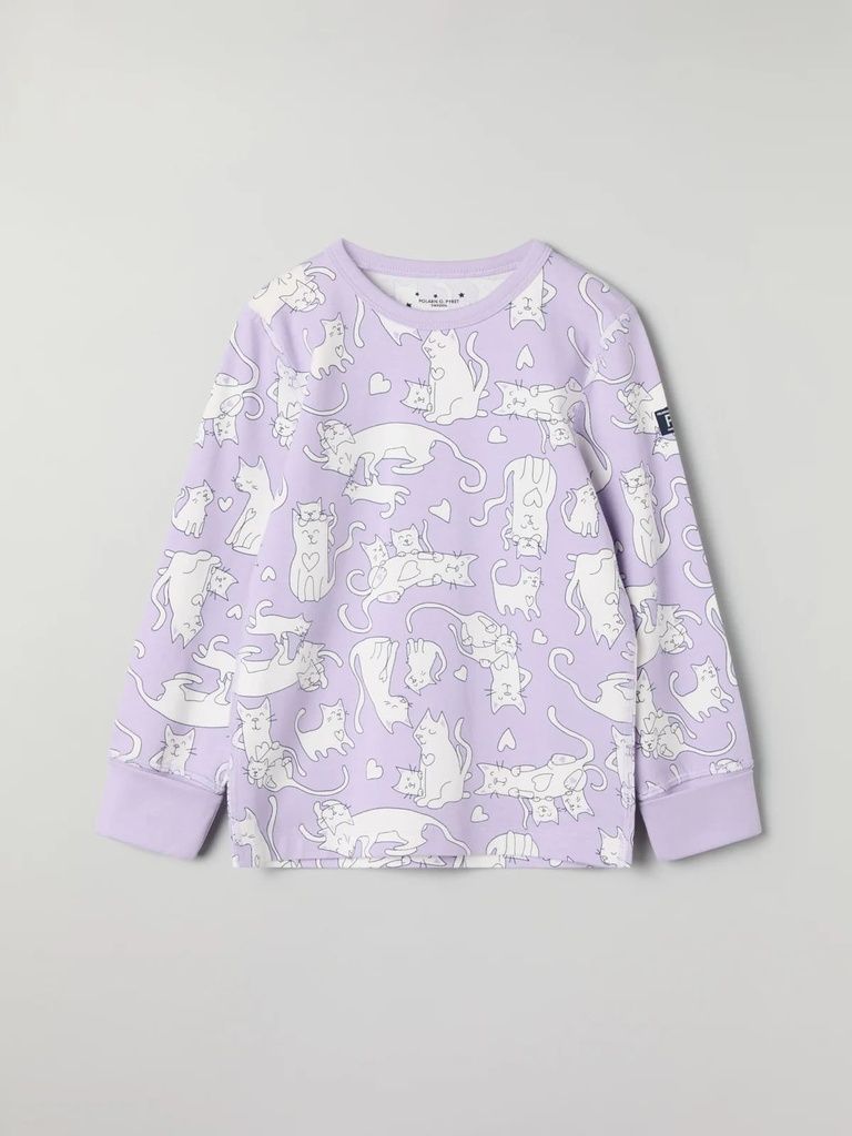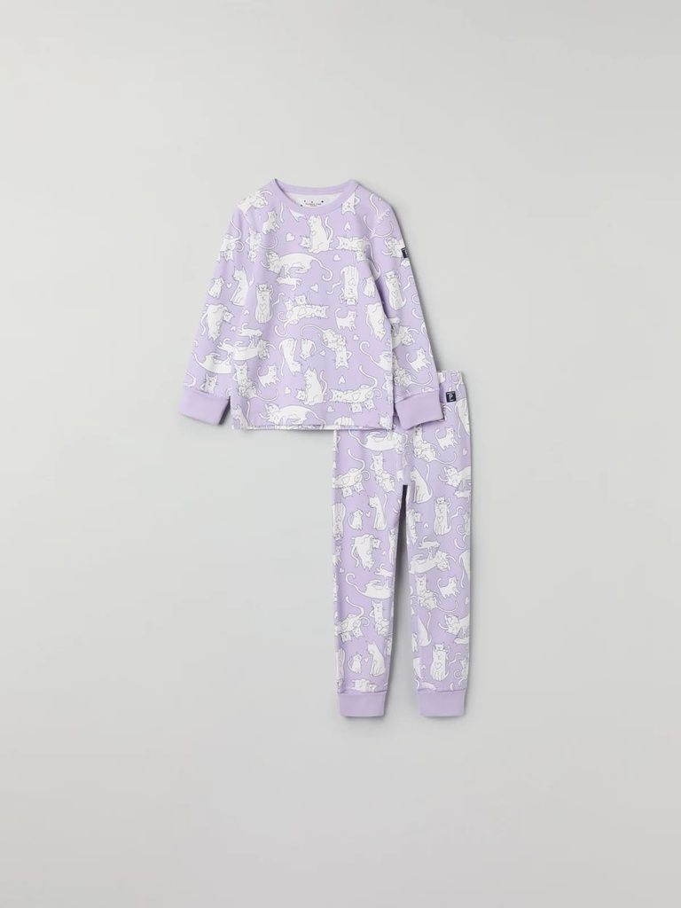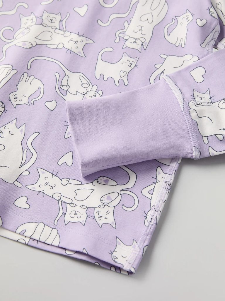 Der zweiteilige Schlafanzug aus weicher Bio-Baumwolle ist durchgehend mit Katzen bedruckt. Das Oberteil hat extra lange Ärmelbündchen zum Umschlagen. Die Hose mit elastischem Bund hat extra lange Bündchen an den Beinabschlüssen.