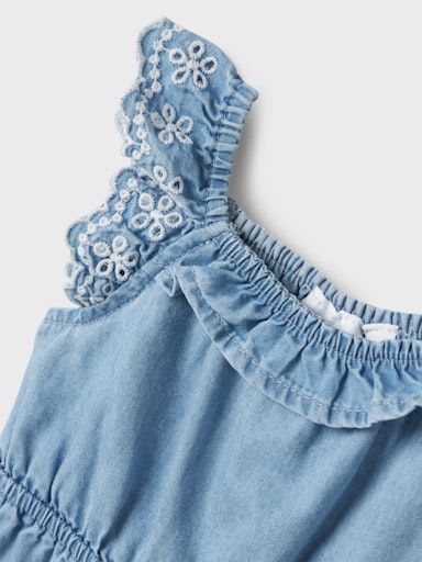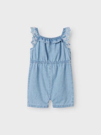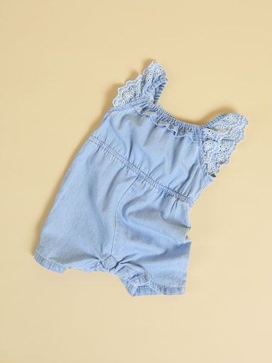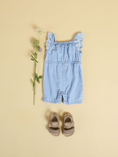Mit diesem Playsuit aus leichtem Denim ist Ihr Kind perfekt für warme Tage gestylt. Der lässige Einteiler vereint Komfort und Stil – die elastische Taille sorgt für eine bequeme Passform, während Rüschen und Spitzendetails für eine verspielte Note sorgen. Dank der leichten Waschung wirkt der Look besonders sommerlich und modern.