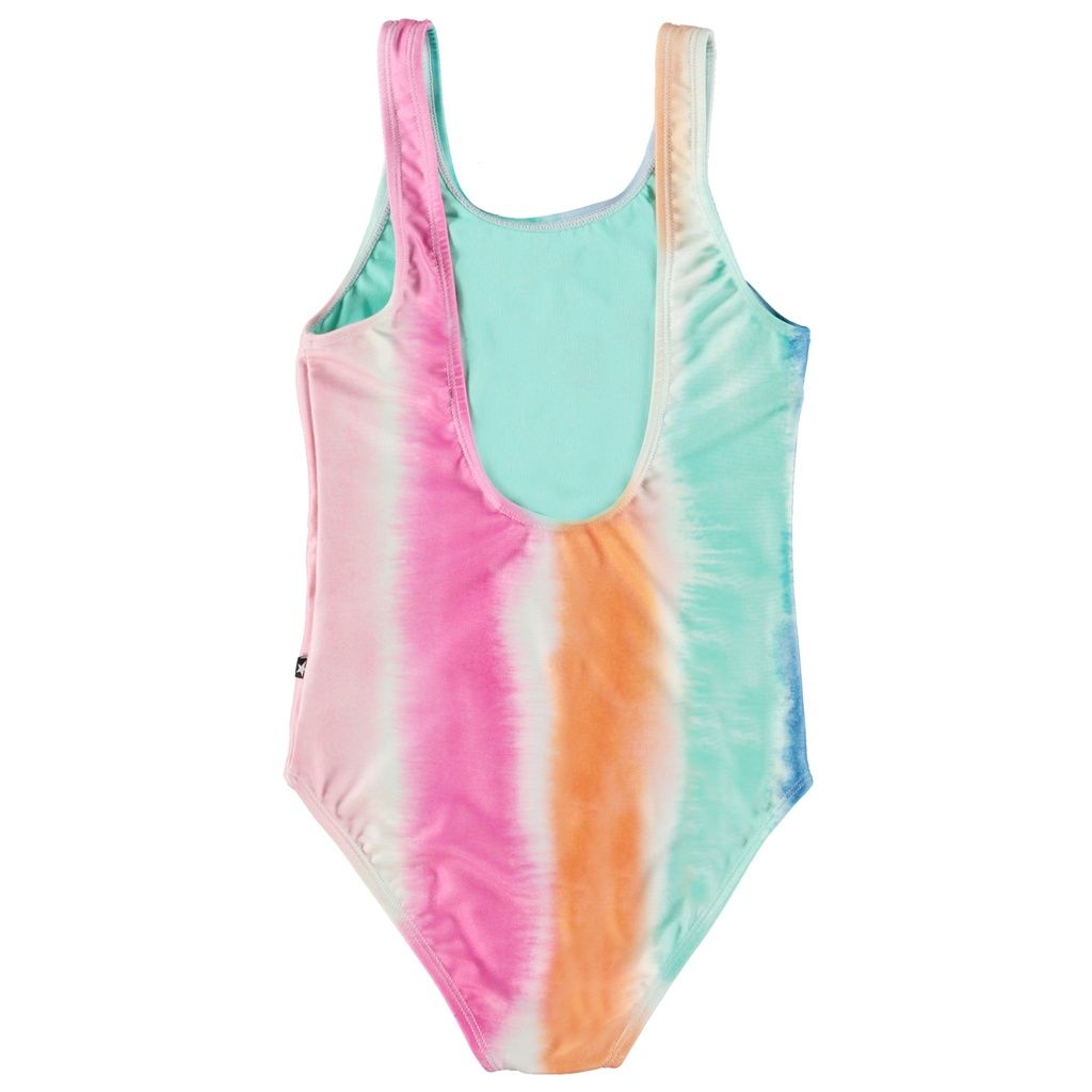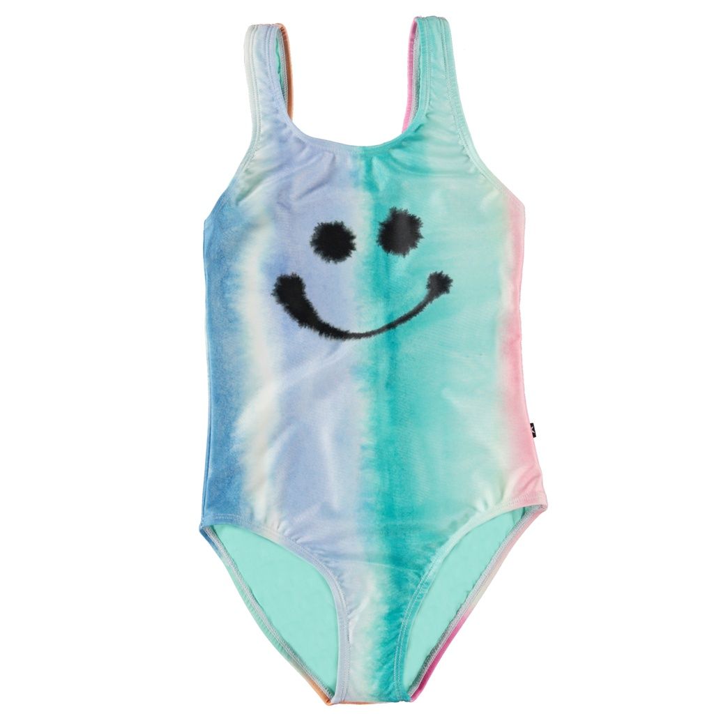 Badeanzug in abgestuften Rosa-, Türkis- und Orangetönen mit rundem Ausschnitt, tiefem Rücken und Placement-Aufdruck eines aquarellierten Emojis auf der Vorderseite. Er besteht aus recyceltem, elastischem Polyester, wodurch er äusserst bequem und einfach an- und auszuziehen ist.