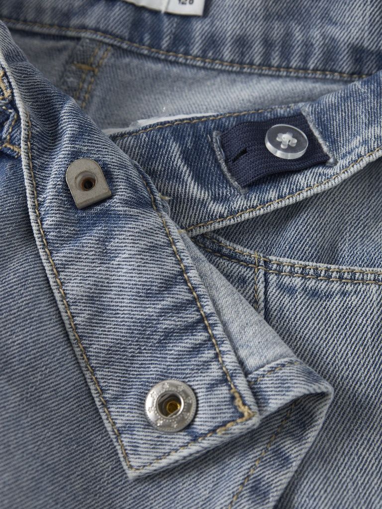 Die normale Passform bietet eine bequeme Silhouette, während der verstellbare Bund für optimalen Sitz sorgt. Der klassische Hosenschlitz mit Haken- und Reissverschluss ermöglicht ein einfaches An- und Ausziehen. Praktische Taschen vorne, eine Münztasche sowie Gesässtaschen bieten Platz für kleine Essentials, während Nieten dem Design einen authentischen Denim-Charakter verleihen.