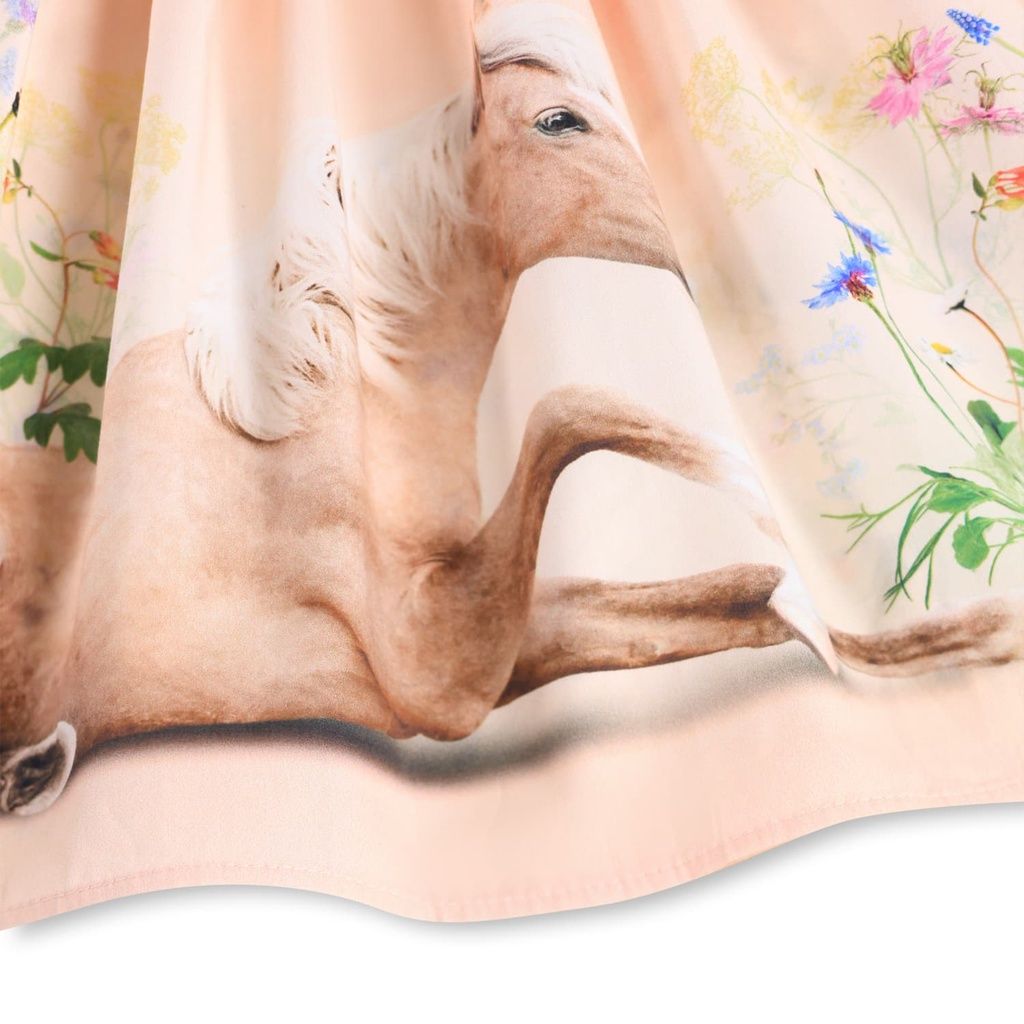 Zauberhaft, komfortabel und perfekt für jeden besonderen Anlass - das pfirsichfarbene Kurzarmkleid von Molo verbindet Stil mit nachhaltiger Qualität. Das eng anliegende Oberteil aus geripptem Jersey sorgt für einen bequemen Sitz, während der weiche Popeline-Rock mit einem detailreichen Print ein Pferd umgeben von bunten Blumen zeigt - ein echter Hingucker für kleine Fashionistas.