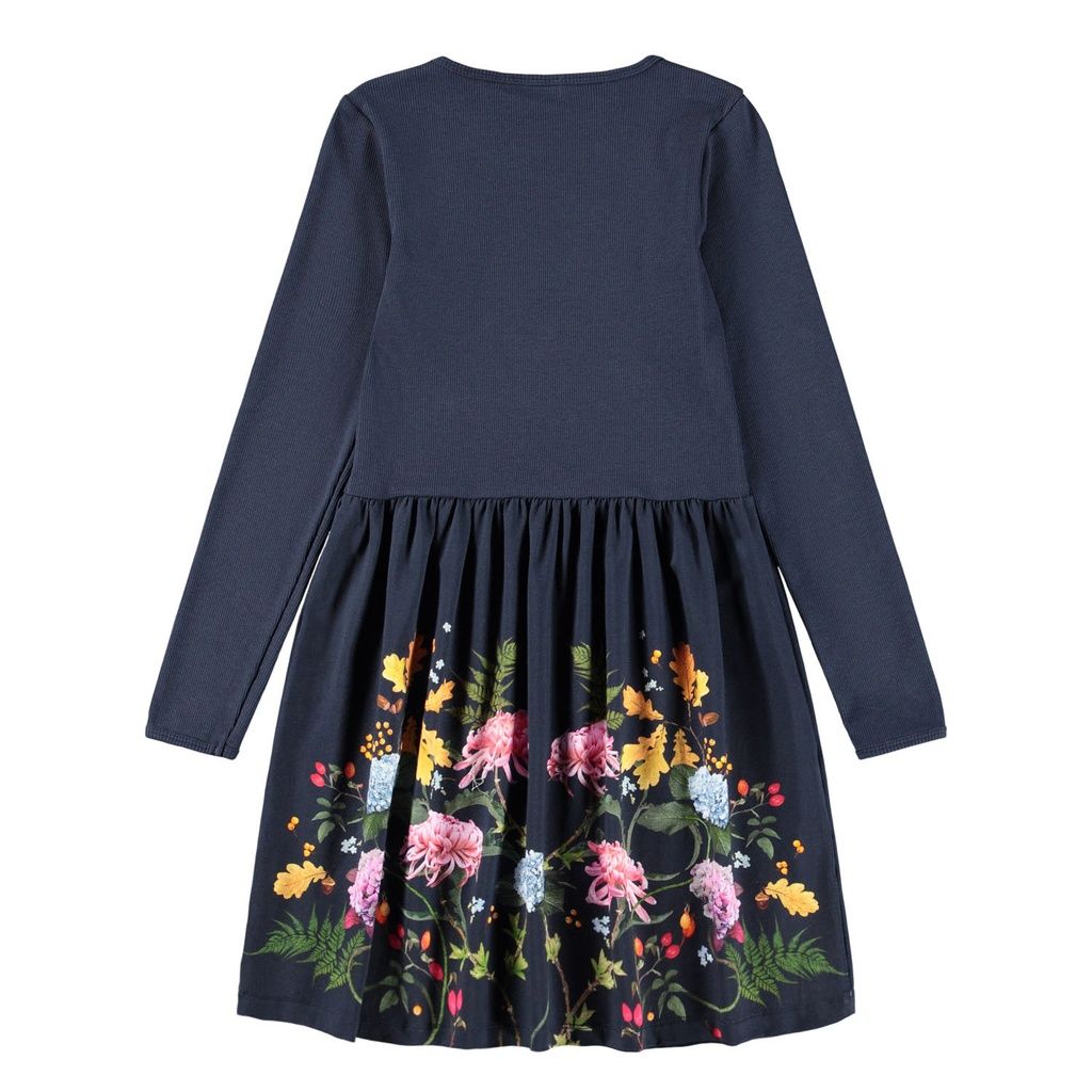 Dieses dunkelblaue Langarmkleid aus Öko-Baumwolle vereint Stil und Bewegungsfreiheit perfekt. Das enganliegende Oberteil aus geripptem Jersey sorgt für einen bequemen Sitz, während der Rock aus glattem Jersey mit einem bezaubernden Blumen- und Blattmotiv bedruckt ist.