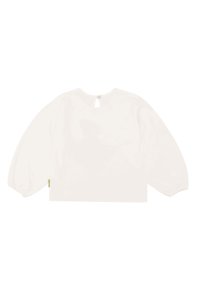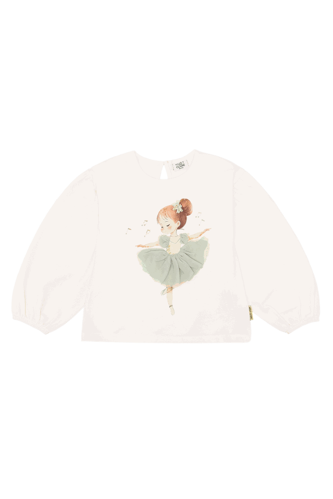 Langarmshirt aus weicher, dehnbarer Baumwolle, verziert mit einem Print, der eine Ballerina darstellt, die mit Tüll und Glitzer verziert ist. Dieses Modell verfügt über geraffte Schultern, elastische Ärmel und einen Knopfverschluss im Nacken.