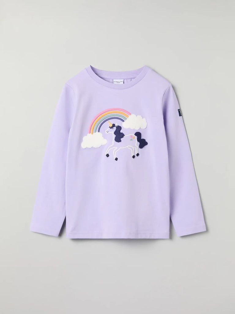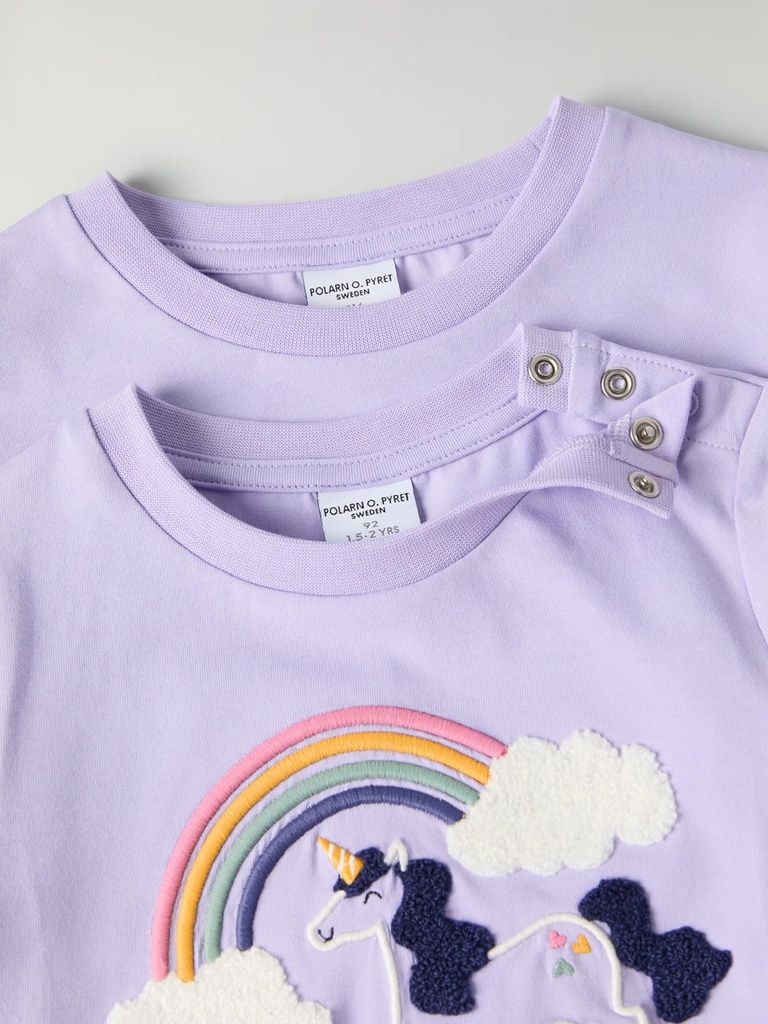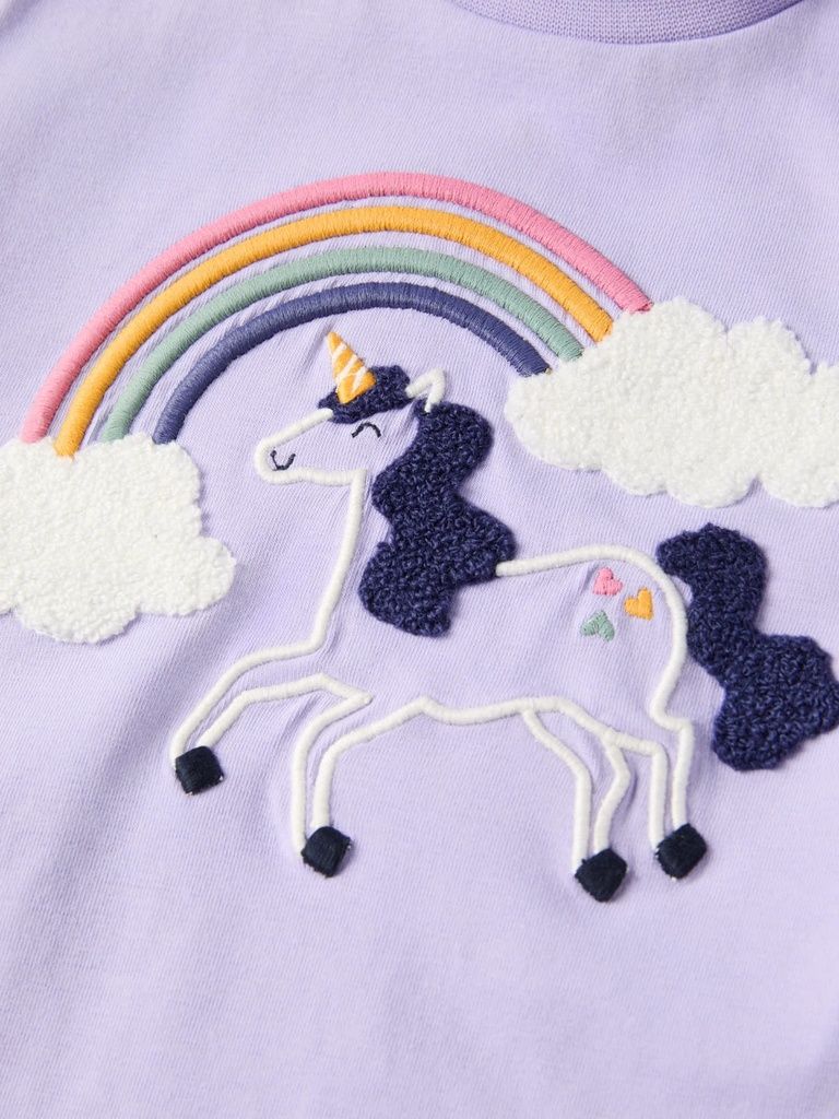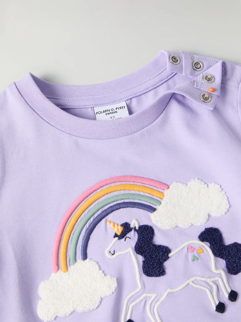 Leichtes, bequemes Shirt aus weichem Bio-Baumwolltrikot. Ein Lieblingsteil, das man lange lieben kann! Das Shirt hat einen grossen Einhornprint auf dem Vorderteil mit gestickten Teilen aus Terry, die hervorstehen.