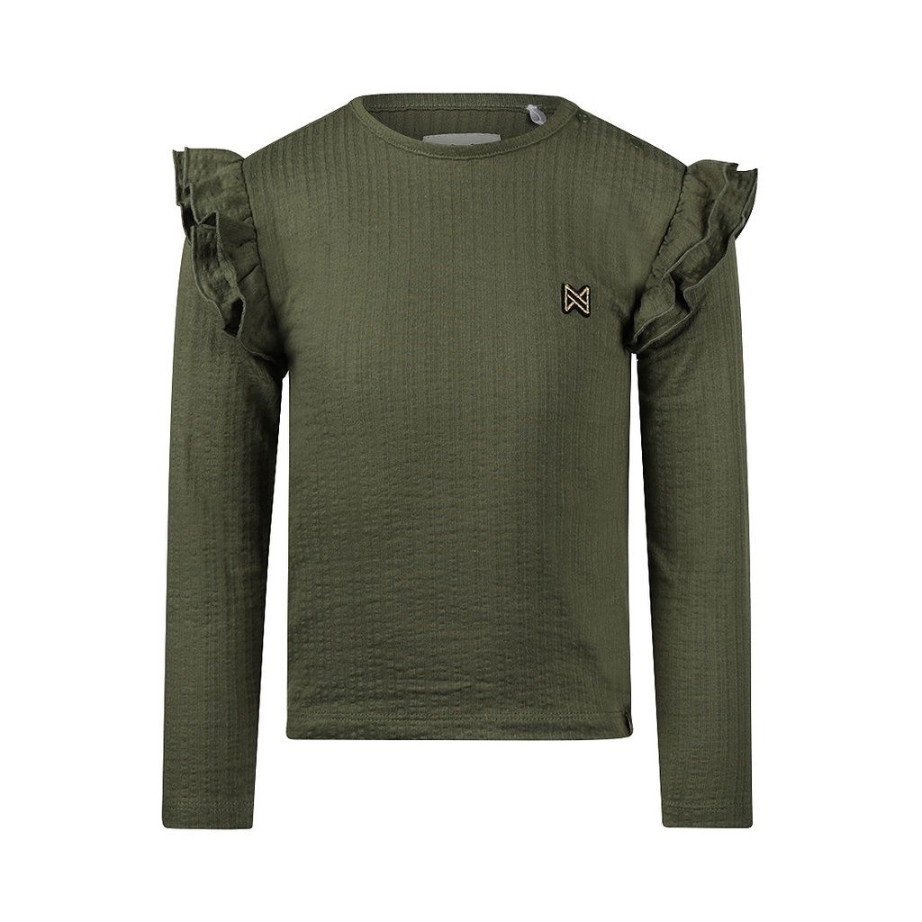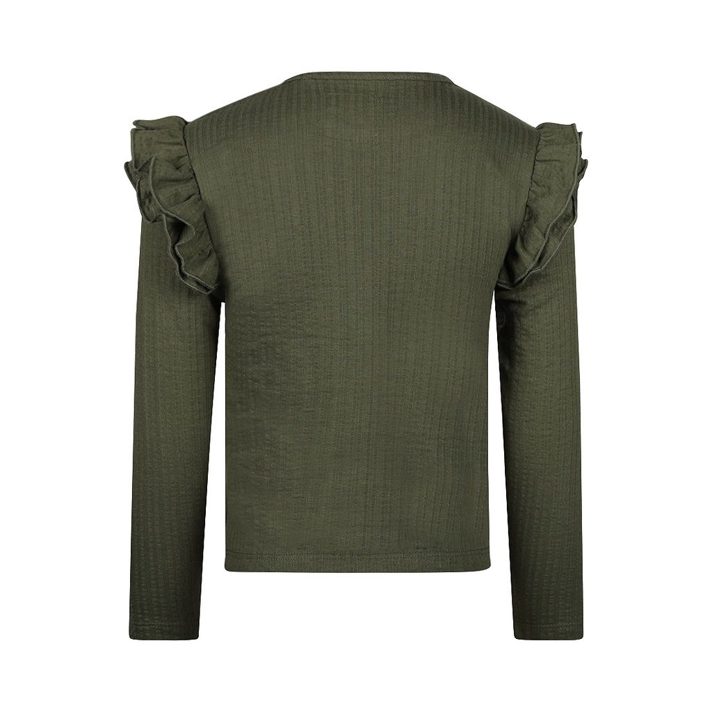 Dieses Koko Noko Longsleeve in Armeegrün ist ein vielseitiges Basic mit liebevollen Details. Die feine Streifenstruktur im Stoff verleiht dem Shirt eine besondere Note, während die Rüschen an den Schultern für einen fröhlich-verspielten Akzent sorgen.