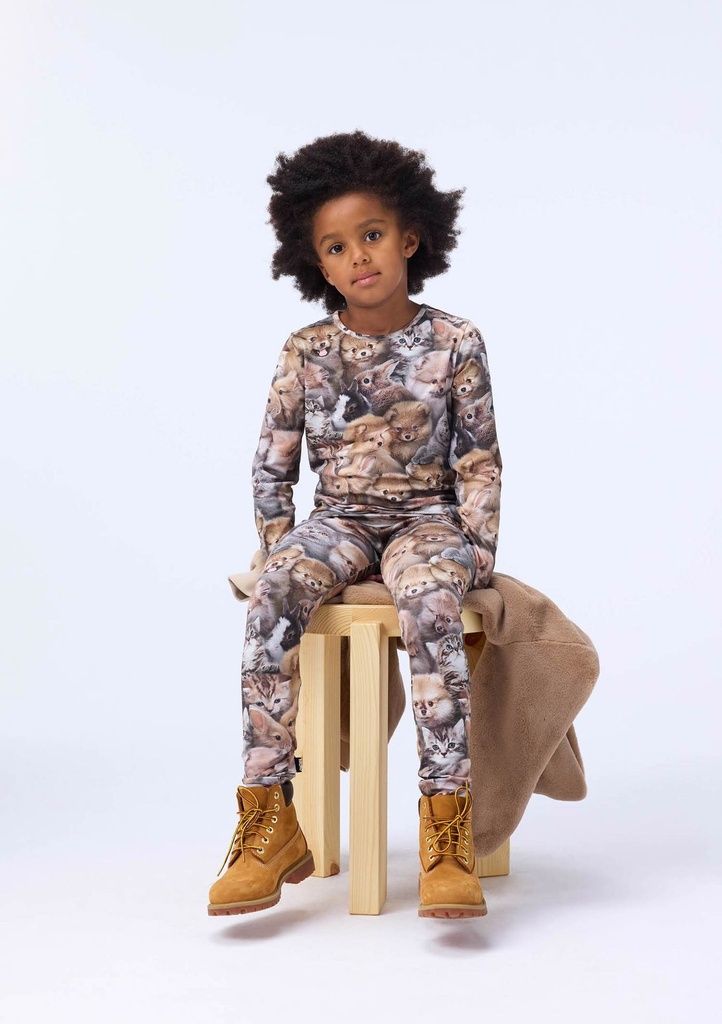 Dieses langärmlige Molo Oberteil für Kinder begeistert kleine Entdeckerinnen und Entdecker mit einem verspielten Allover-Print süsser Tiere. Hergestellt aus weicher, GOTS-zertifizierter Bio-Baumwolle, bietet es ganztägigen Tragekomfort und ist dabei besonders nachhaltig.