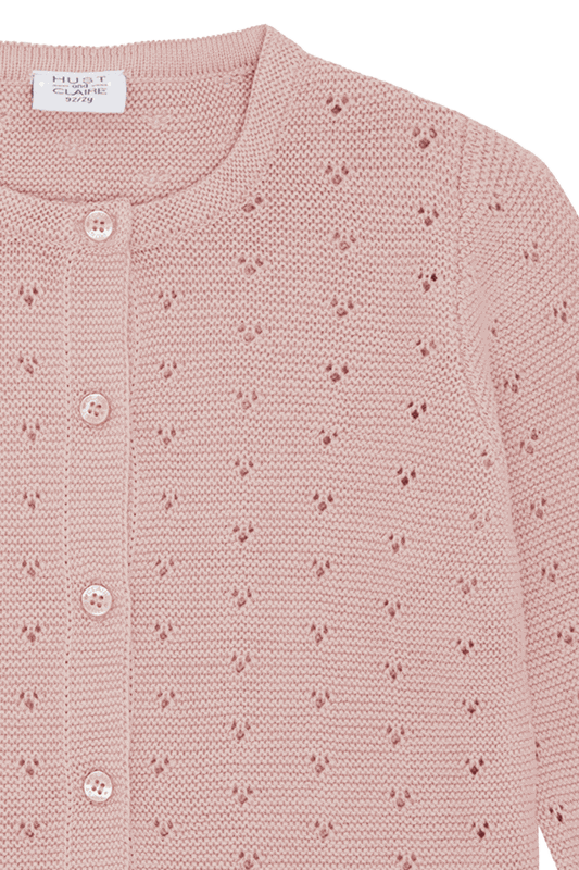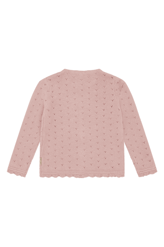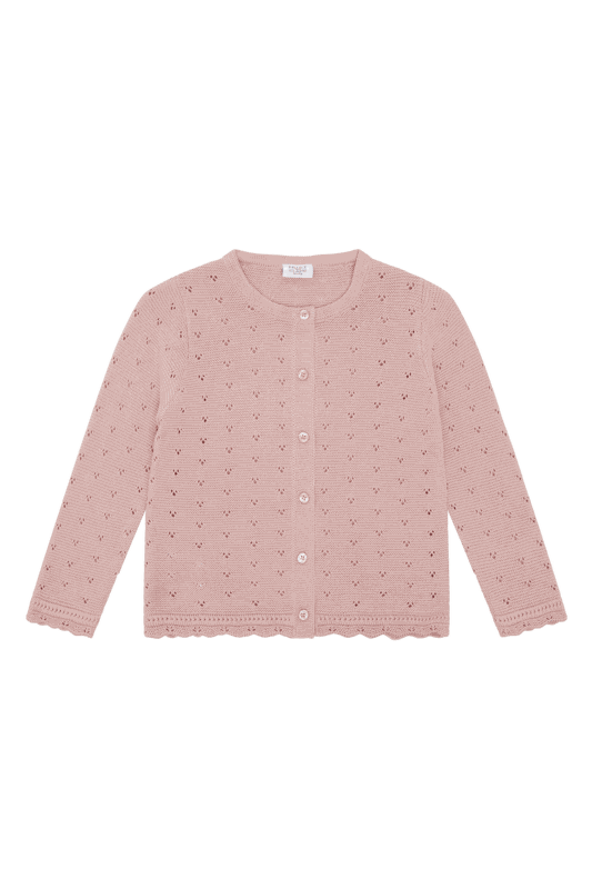 Strickjacke aus weicher Baumwolle mit einem Lochmuster und einem Knopfverschluss entlang der Vorderseite. Dieses Modell hat gewellte Ärmel und einen gewellten unteren Rand.